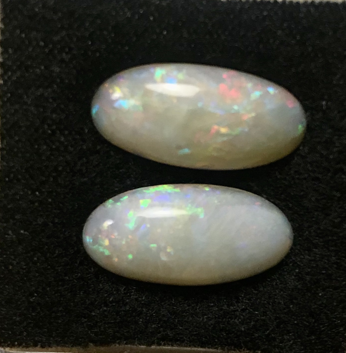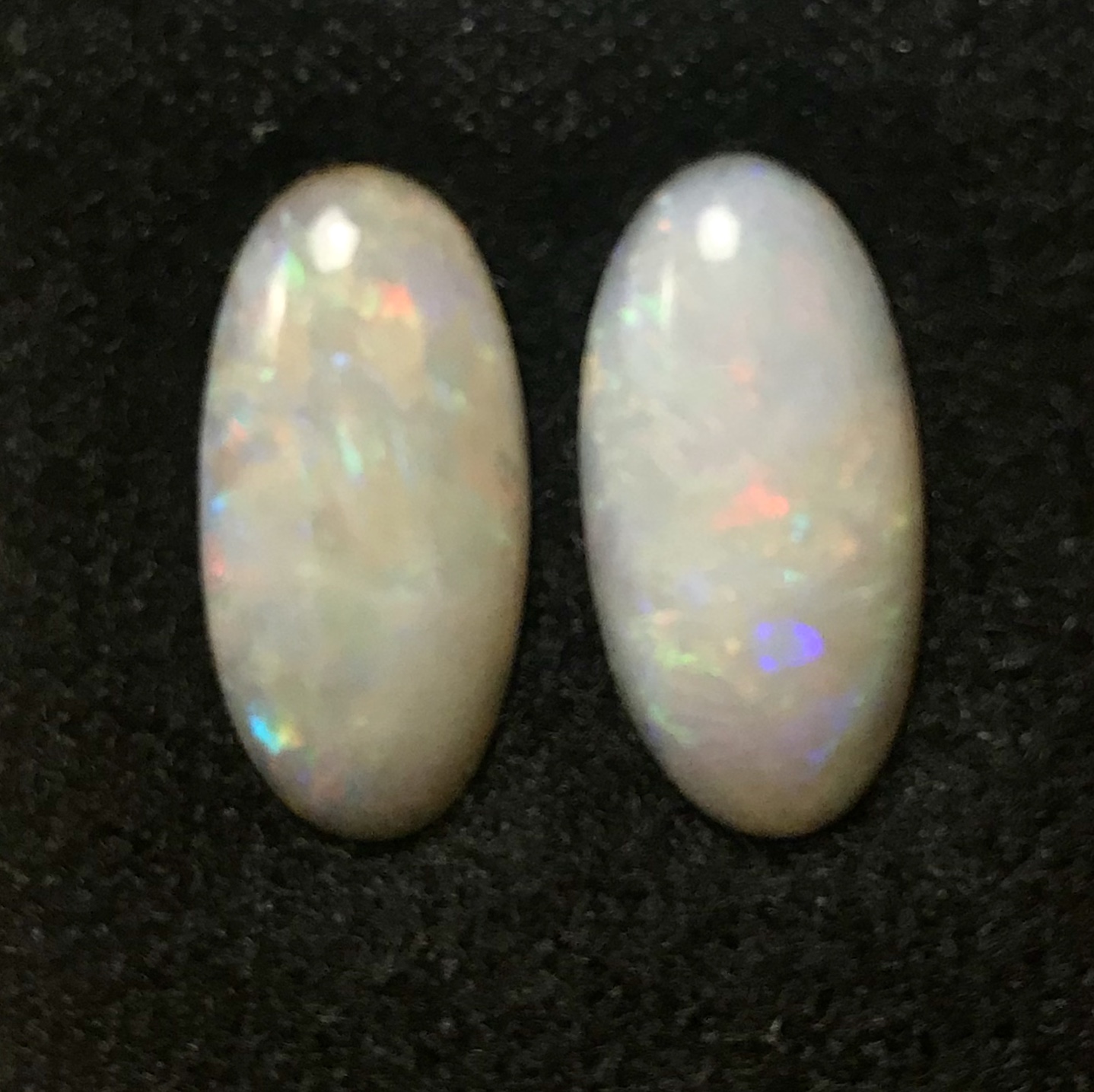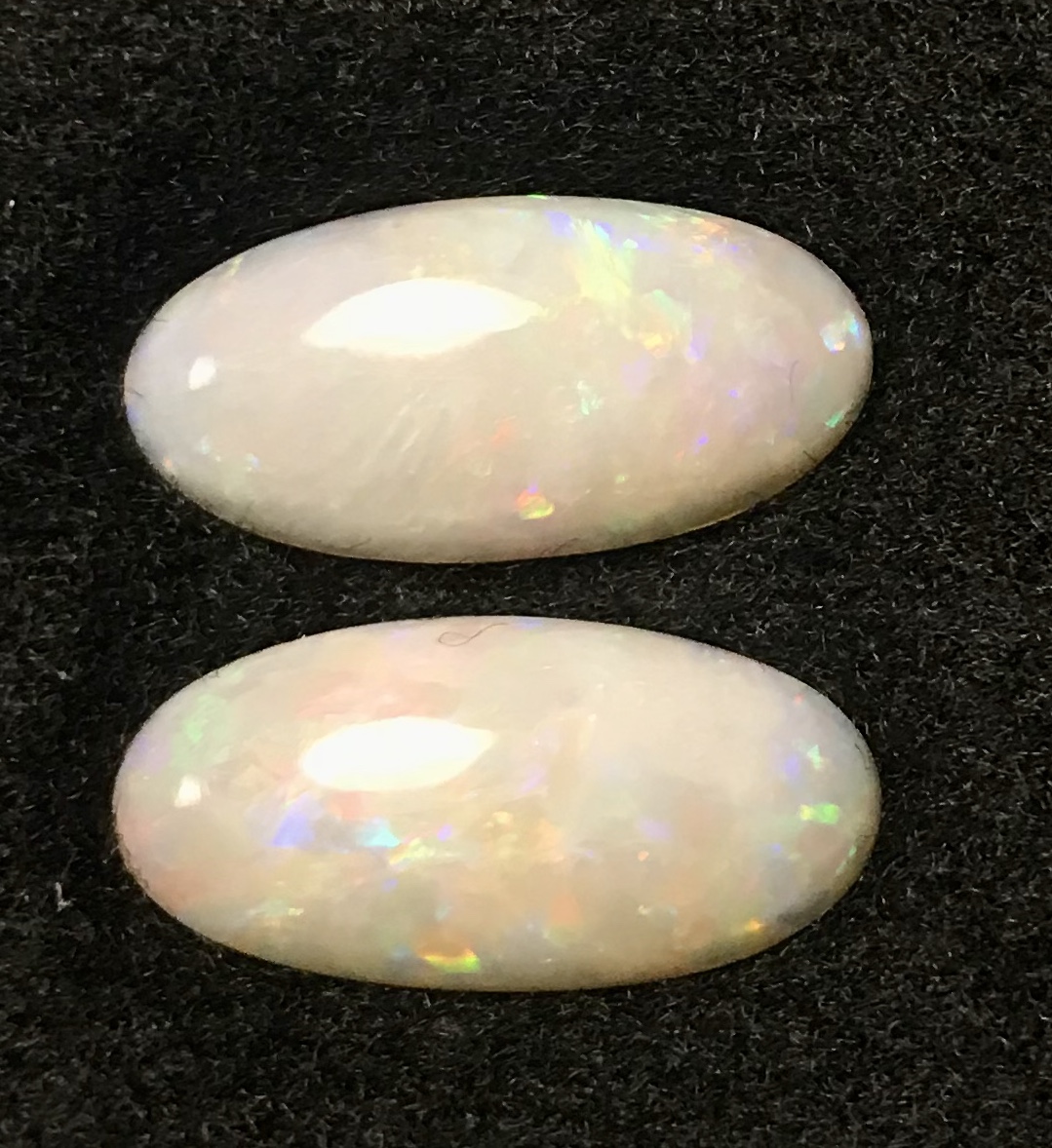 Wunderschönes Australisches Weißes Opal Paar in Oval geschliffen. Diese traumhaften Opale haben einen wunderschönen blau-grünen und roten
