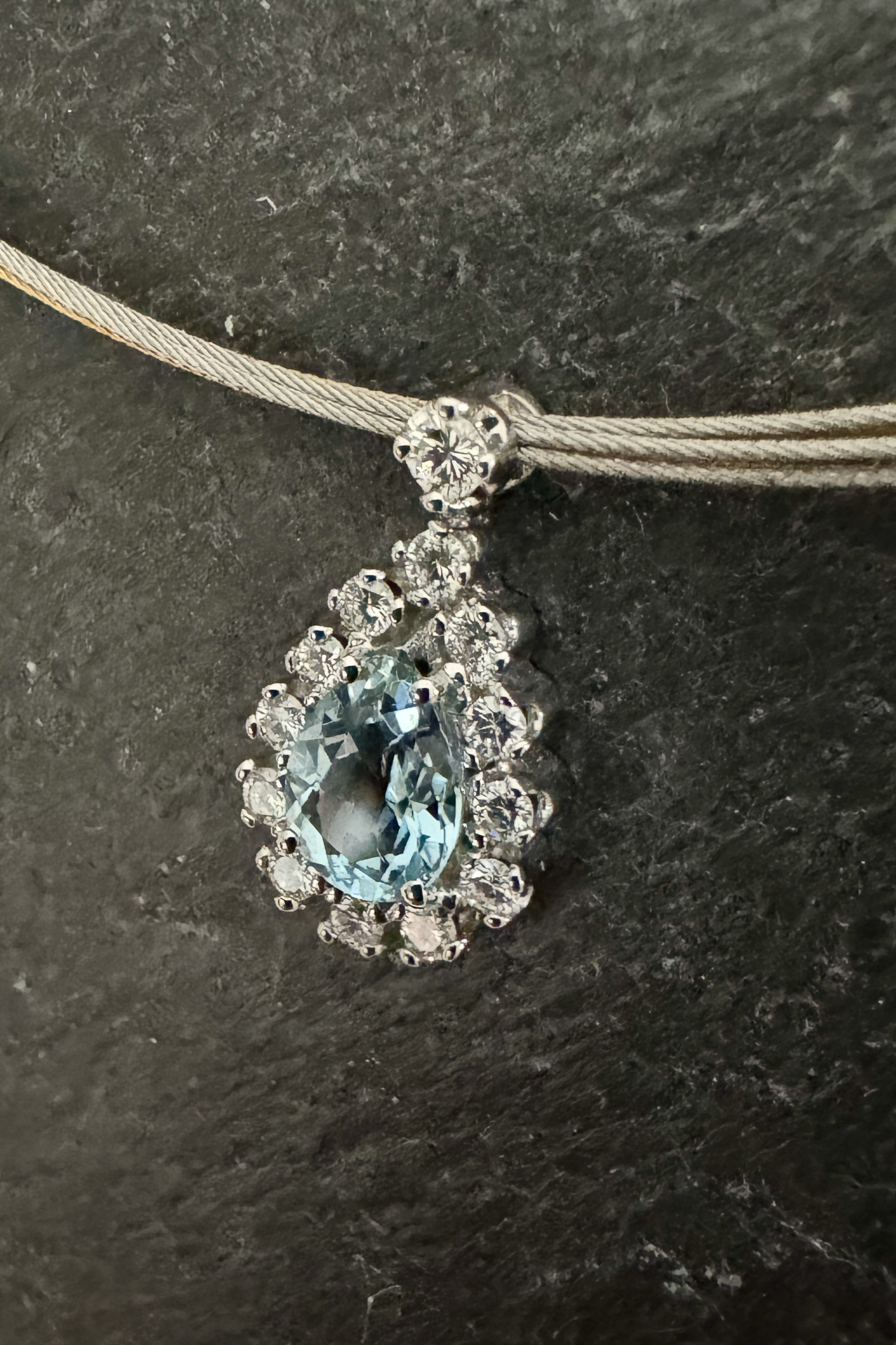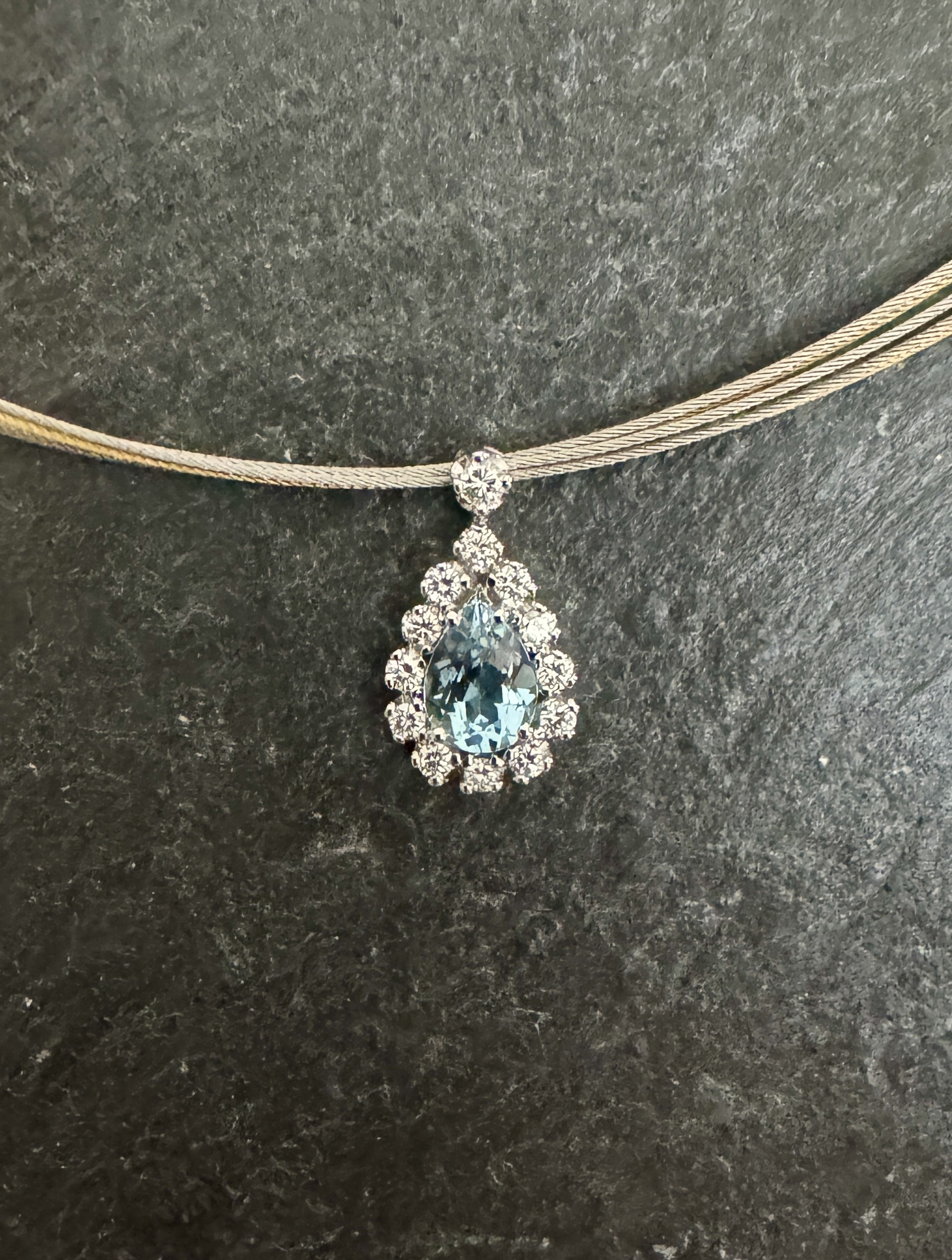Exklusiv präsentiert sich dieser Tropfen Anhänger in Aquamarin und Brillant mit seinem prächtigen Glanz und der formvollendeten
