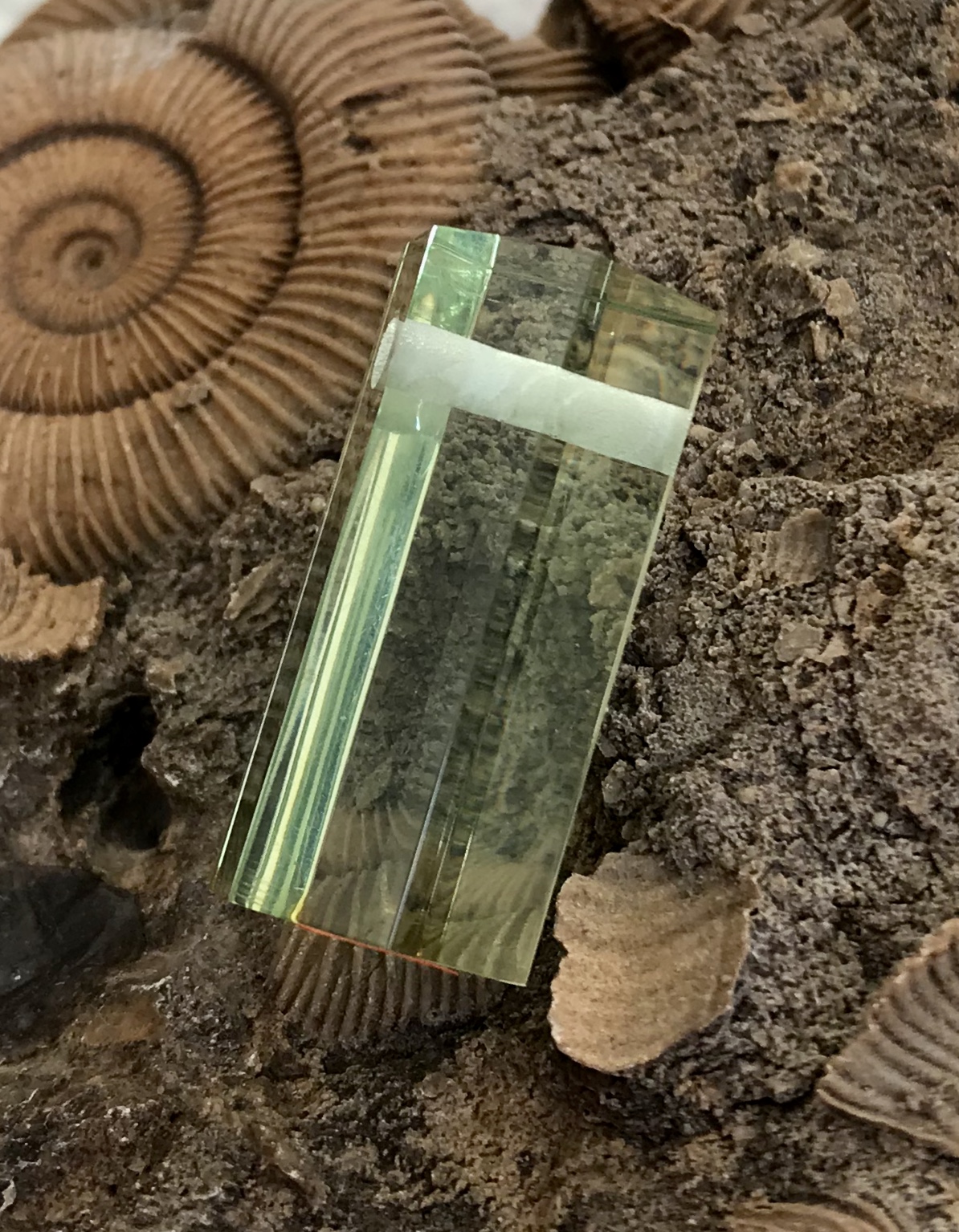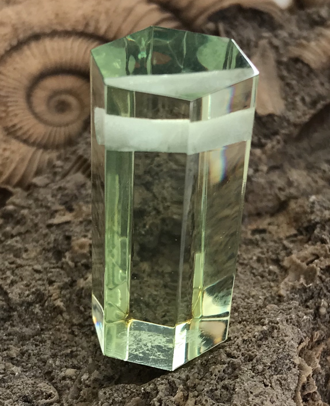 Das prächtige 6eck hat ein leichtes mint Grün mit keinen "Blitzern" im Innern des Steines.