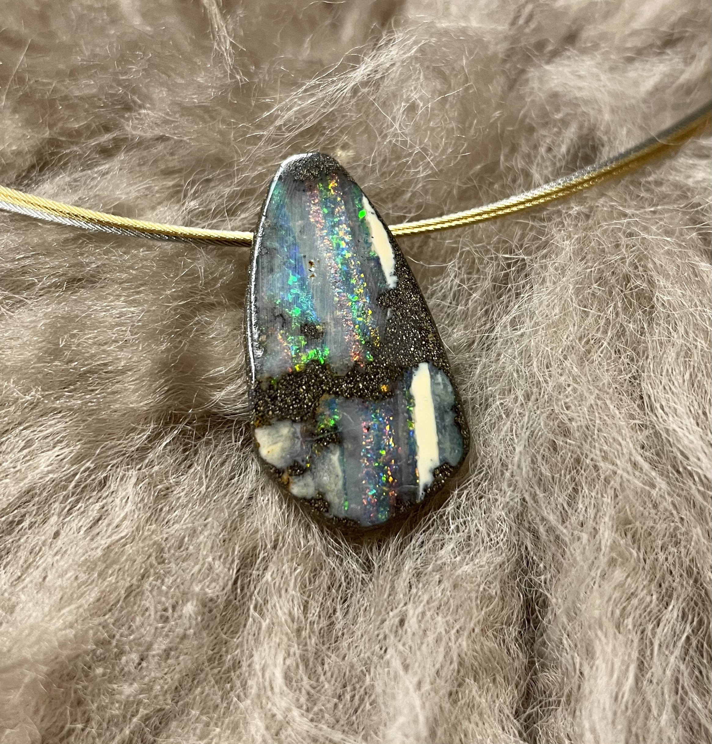 Dieser zeitlose Boulder-Opal Anhänger überzeugt durch sein natürliches Design. Er ist gebohrt und harmoniert mit allen Bändern oder Ketten. Sein Farbenspiel wird Sie verzaubern. Der Opal hat eine Größe von 29 x 16 mm und ein Gewicht von 5,22 g Im Preis inbegriffen ist das 5 reihige Edelstahlband in 42 oder 45 cm Länge. Das Band ist in 3 verschiedenen Farben erhältlich.