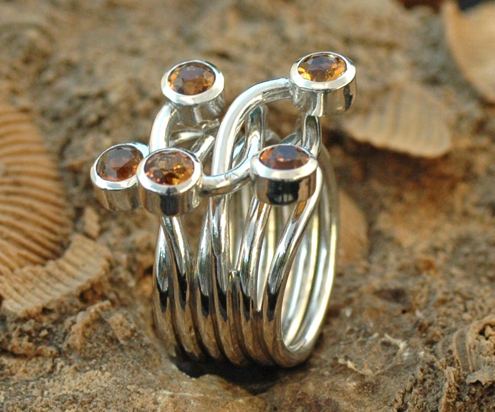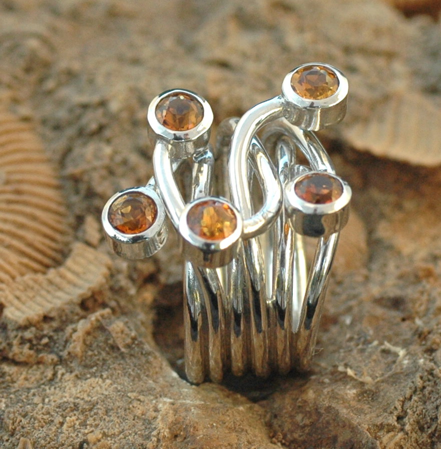 Modern gestylter Silberring mit 5 leuchtenden, runden Palmeira Citrinen von 5 mm Durchmesser.