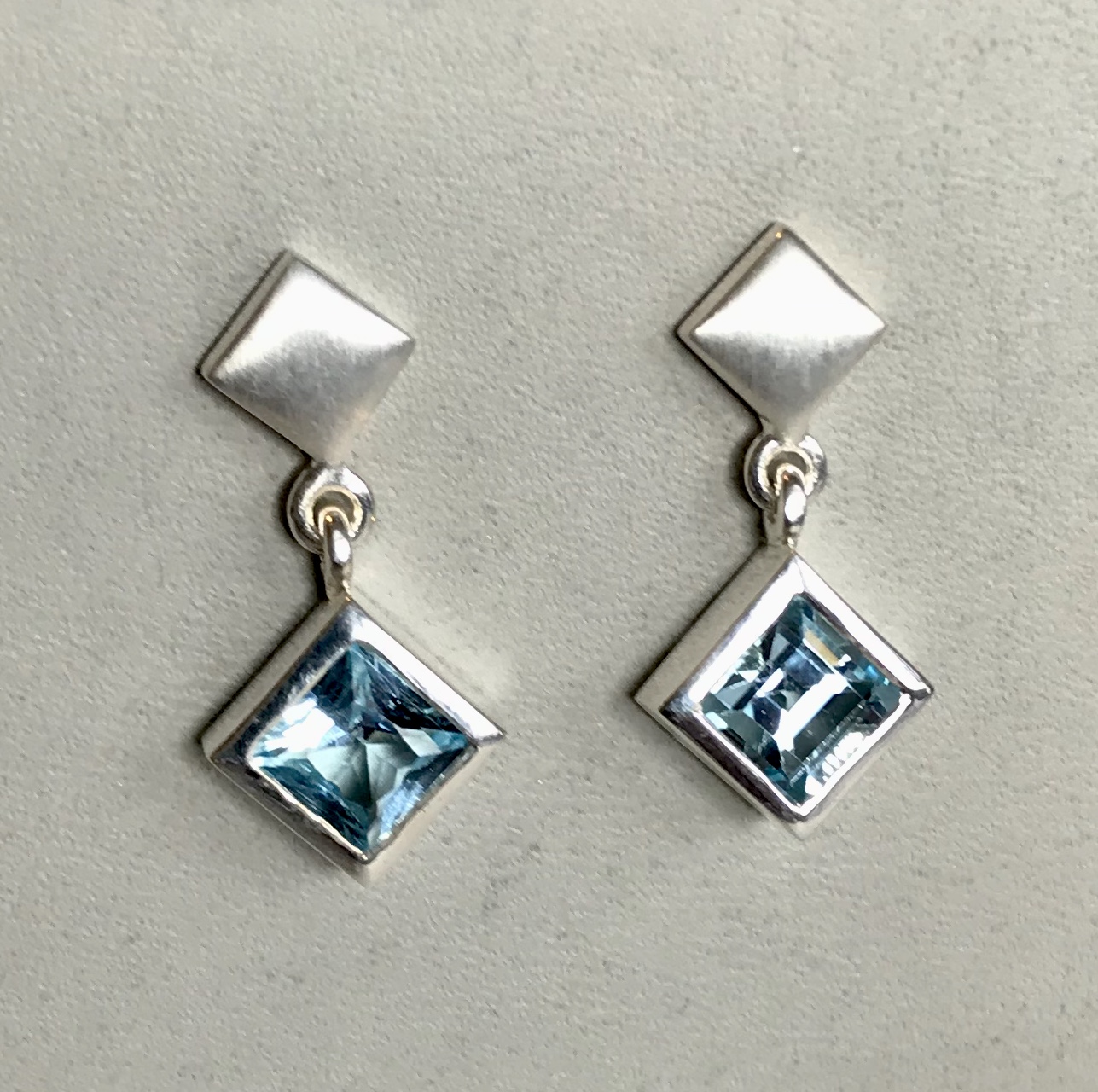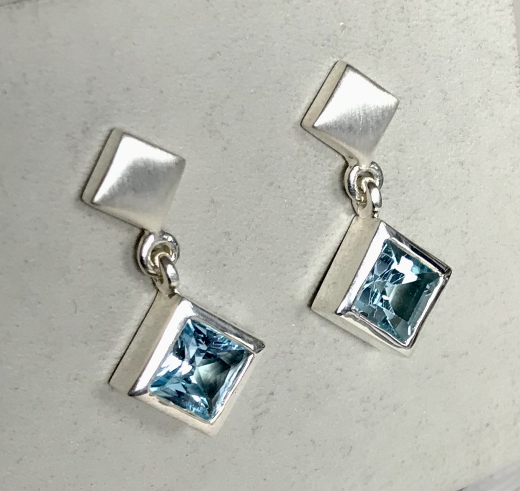 Die Edel Topase haben eine Größe von 6 x 6 mm und sind in eine Zargenfassung gefasst. An der Steckerspitze, befinden sich noch 2 kleine Silbercarres, für die