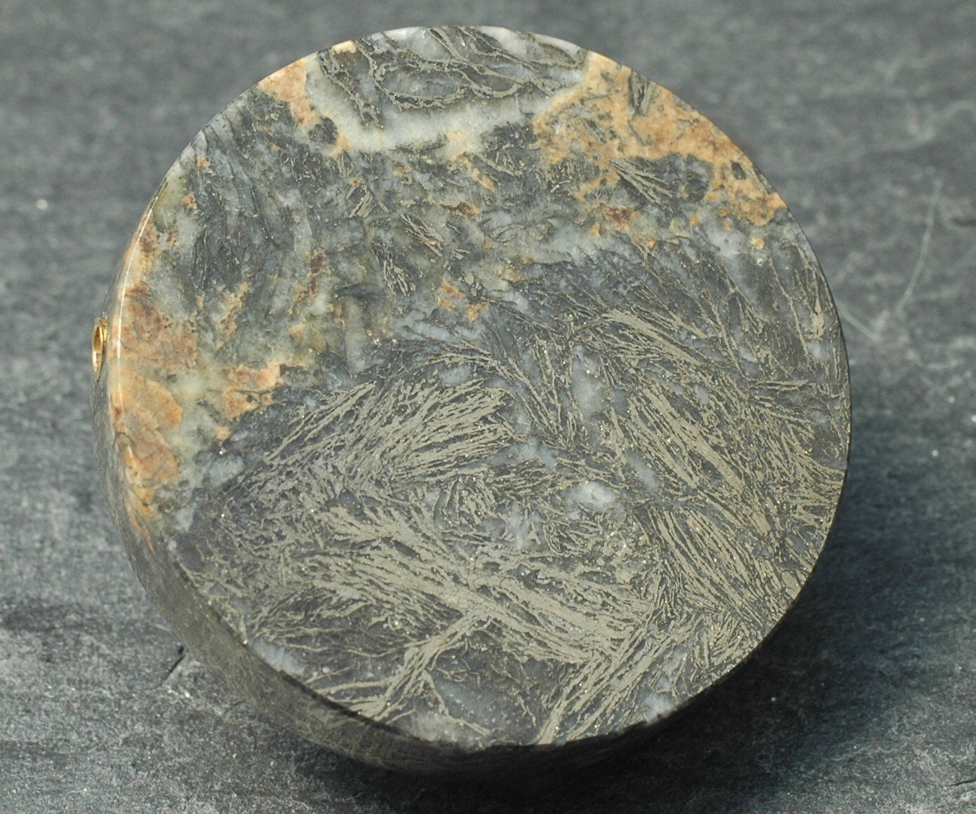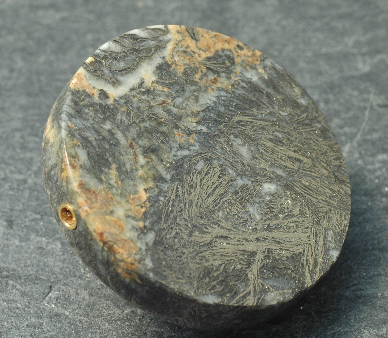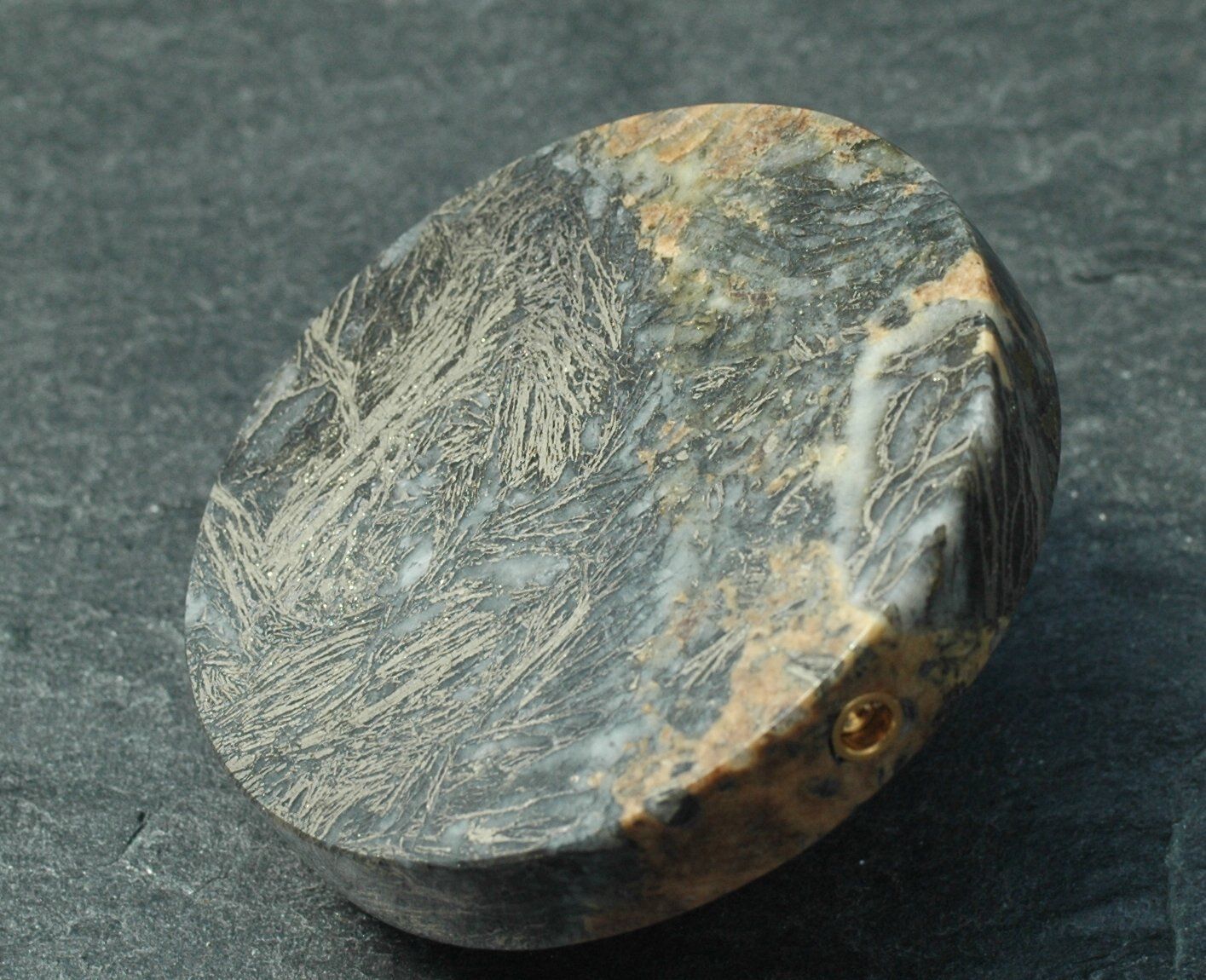 Toller Federpyrit Anhänger in ansprechender, runder Form mit schönen metallischen Pyrit Einschlüssen.