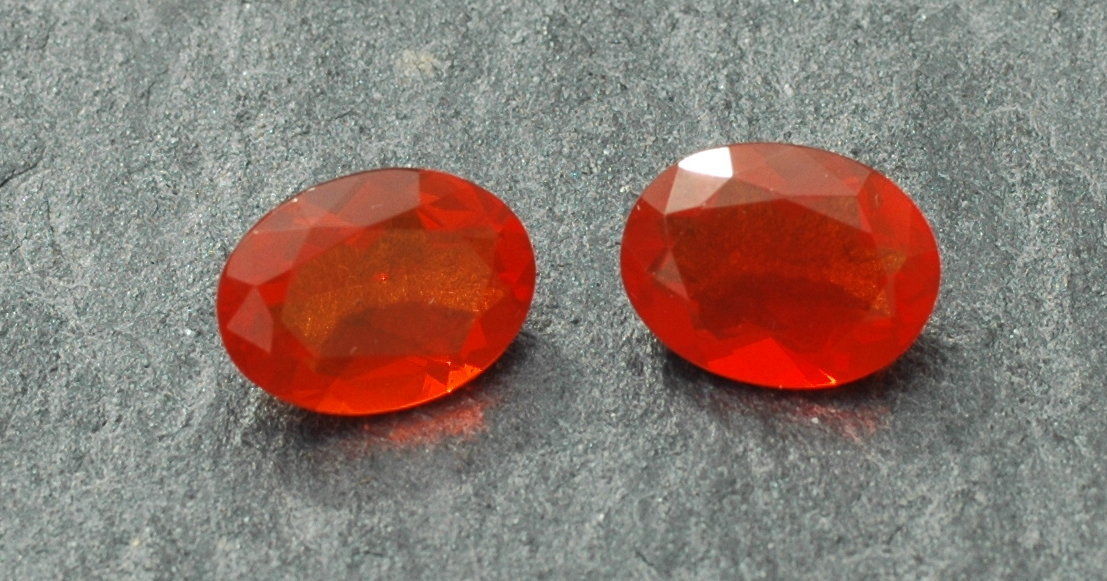 Prächtiges Feueropal-Paar, unbehandelt, 100% Natur. Durch die geschliffenen Facetten und den ovalen Schliff, kommt das leuchtende Orange-Rot besonders gut zur Geltung. Die Steine haben sehr kleine natürliche Einschlüsse und nur mit einer Lupe zuerkennen, eine Größe von 11 x 8 mm und ein Gewicht von 3,80 ct.
