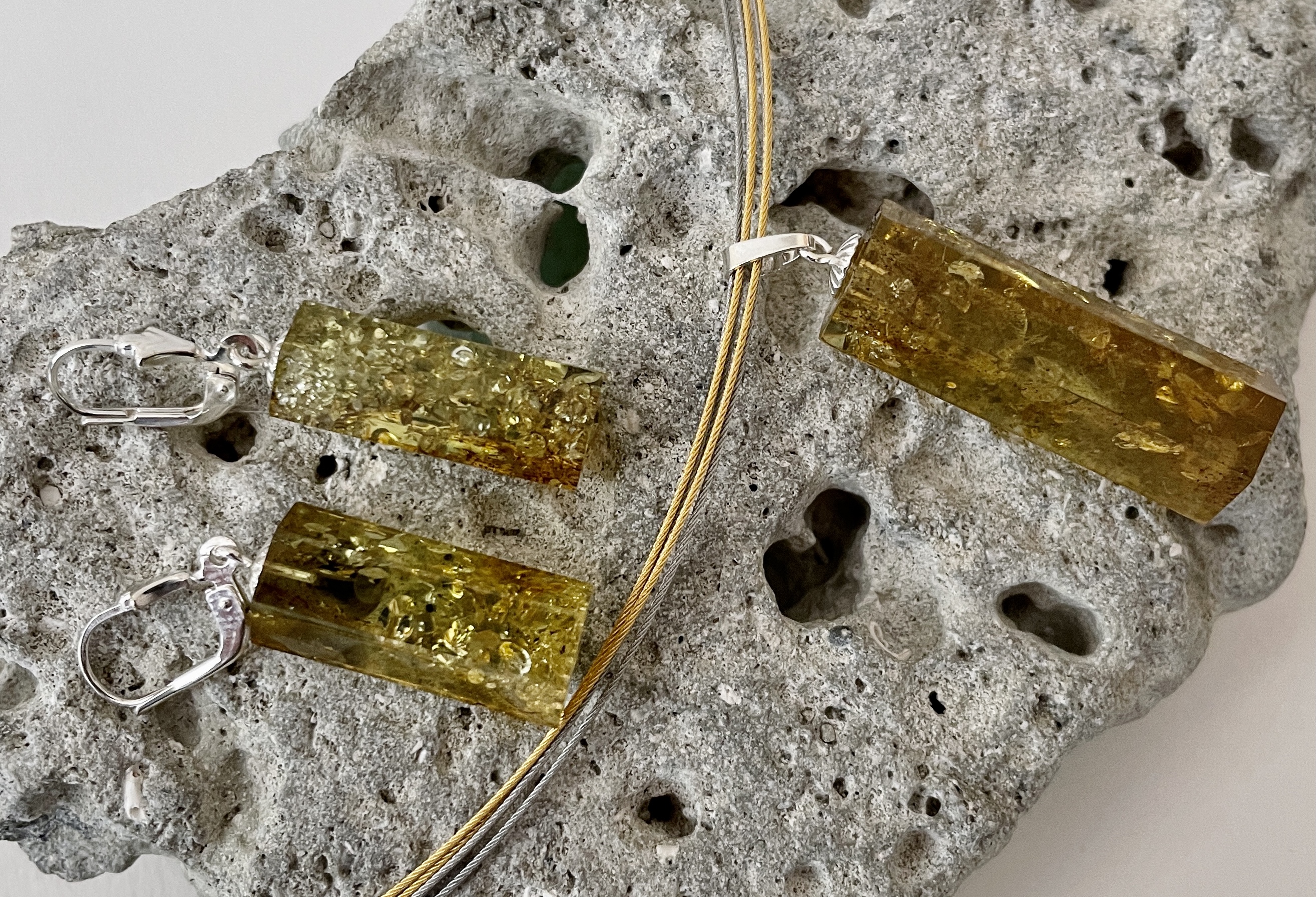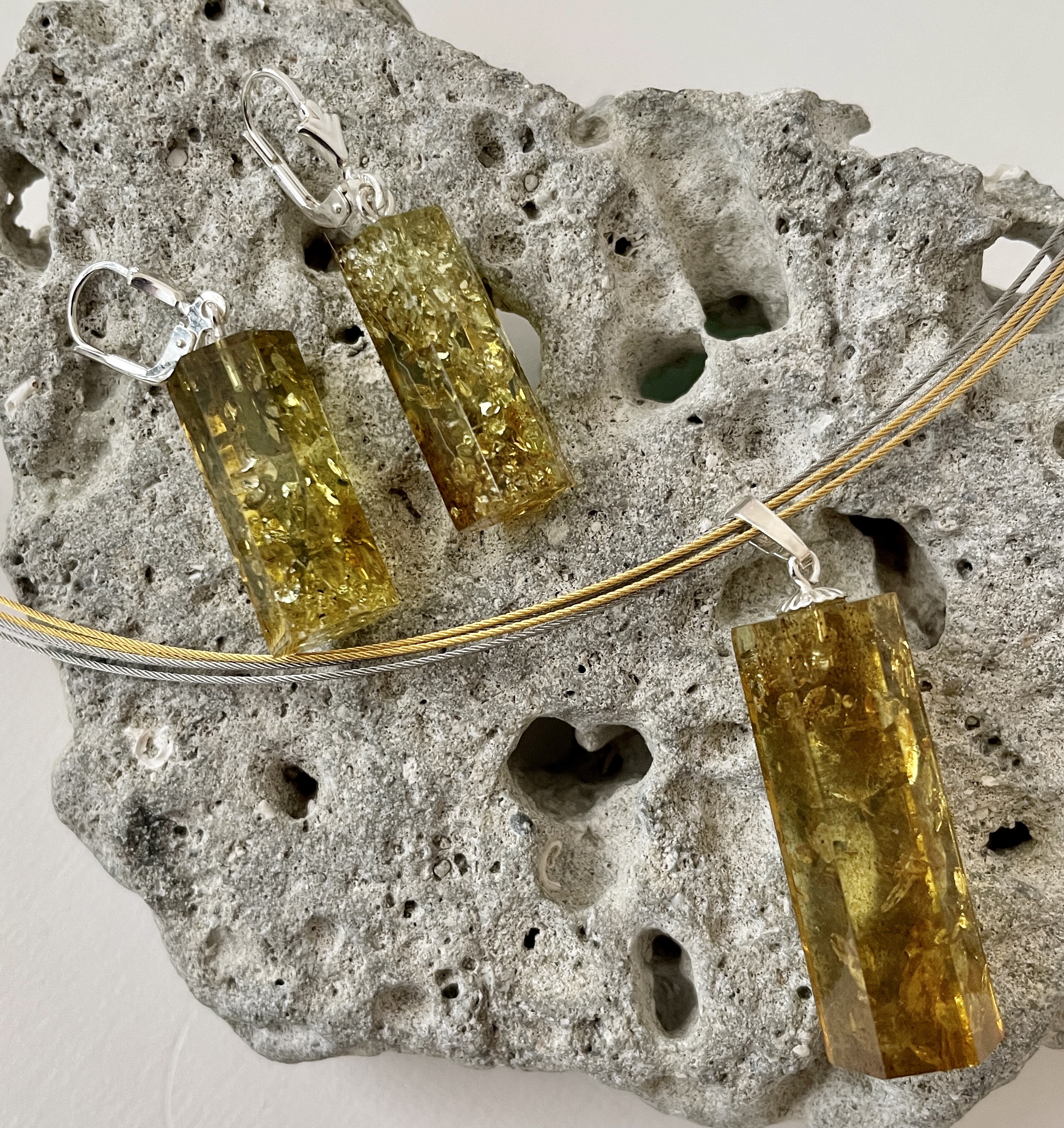 Diese Schmuckstücke beeindrucken mit je einem funkelndem grünen Bernstein von 35 mm Gesamtlänge und einer Breite von ca.9 mm. Der Anhänger hat eine Länge von 38 mm mit der angebrachten Silberschlaufe. Die strahlenden Steine wurden in 6 eck Form facettiert, was ihren natürlichen Glanz noch um ein Vielfaches verstärkt.