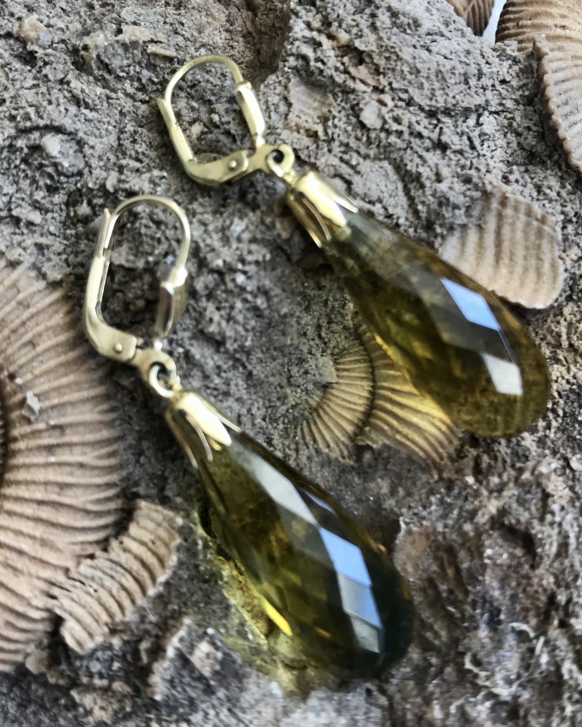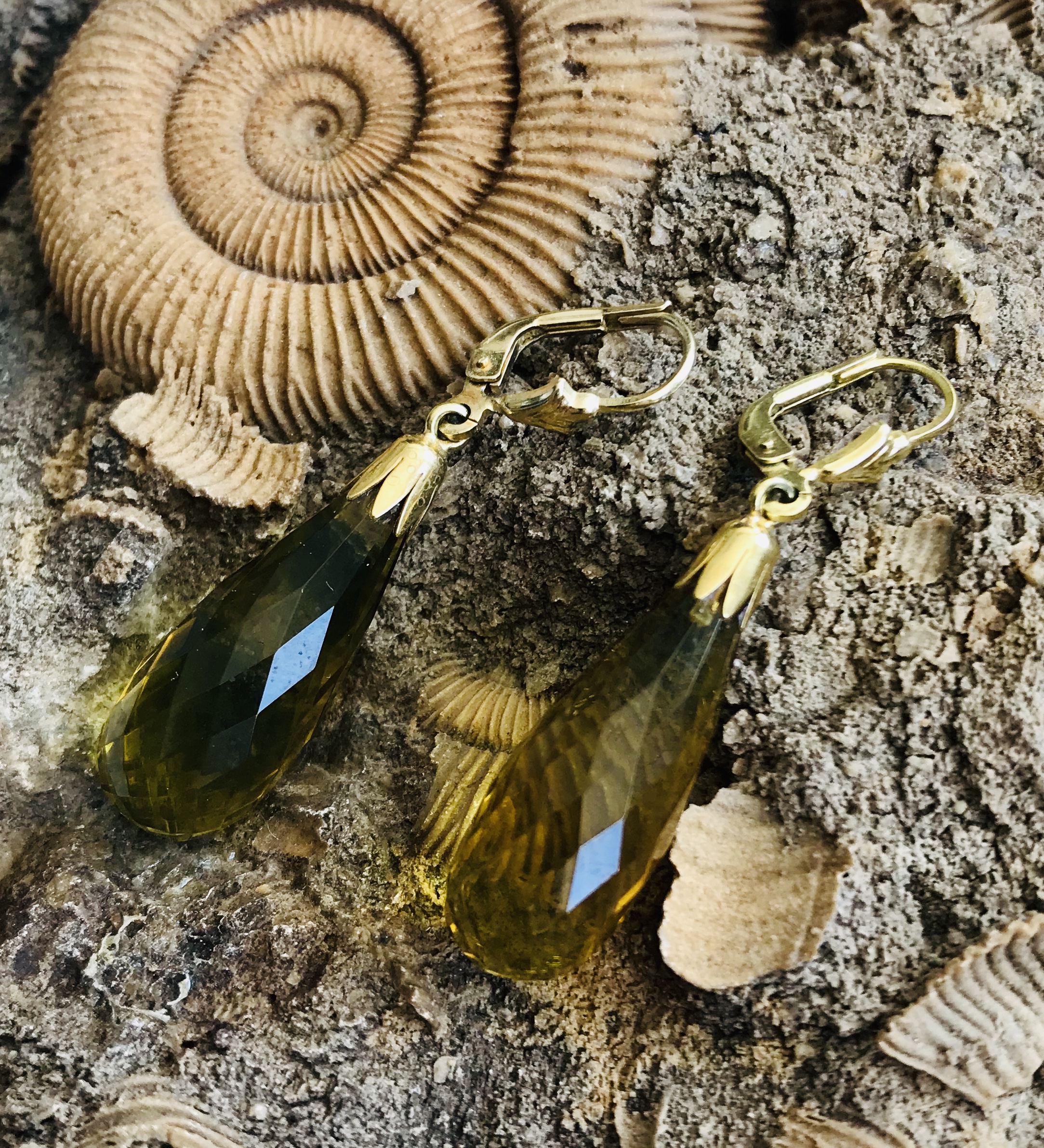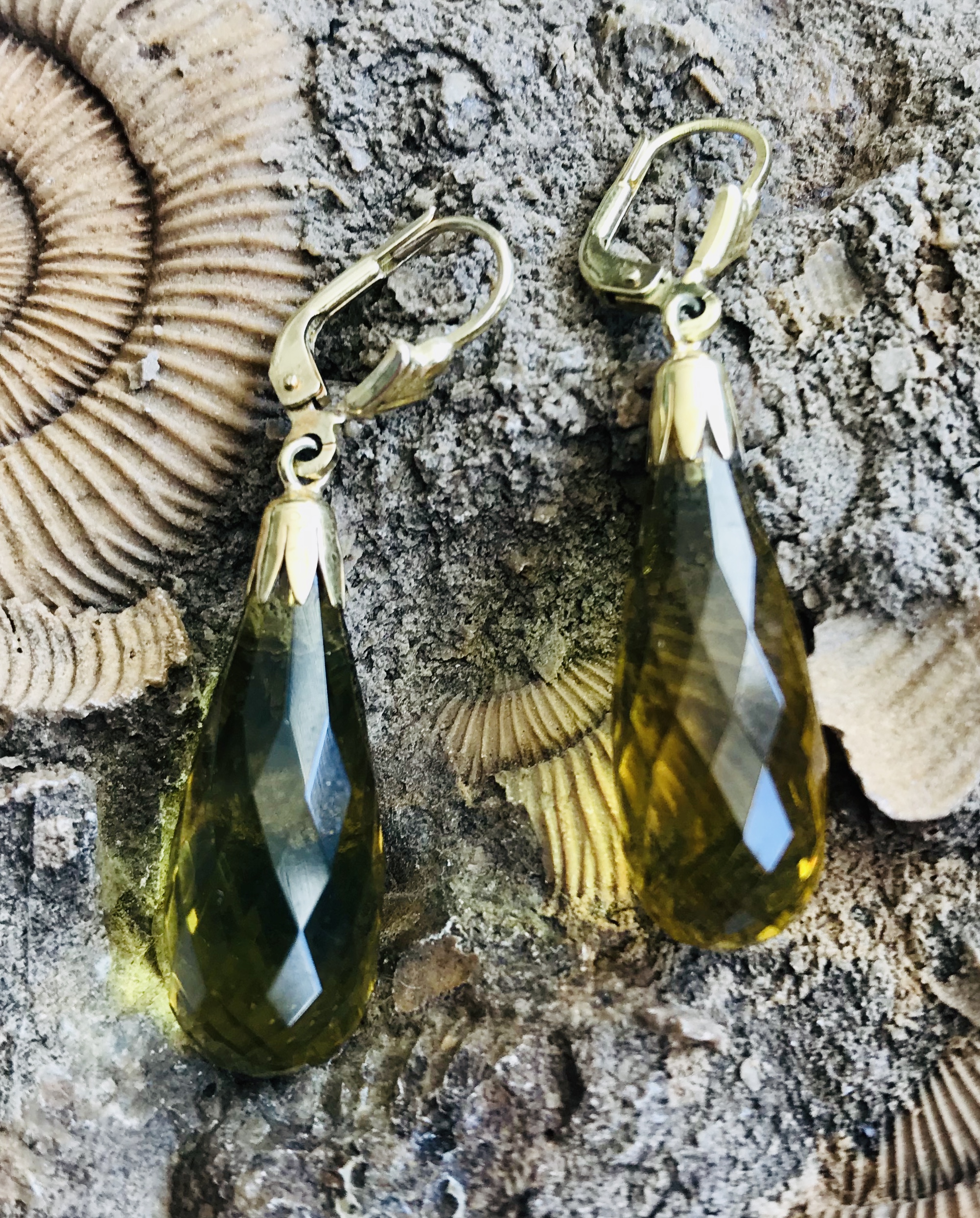Ausdrucksstarke Ohrhänger aus Messing vergoldet. Sie ziehen die Aufmerksamkeit mit je einem funkelnden grünen Bernstein mit einer Gesamtlänge von ca. 40 mm Länge und einer Breite von 10 mm auf sich. Die leuchtenden Steine in Pampelform wurden facettiert, was ihren natürlichen Glanz noch um ein Vielfaches verstärkt.