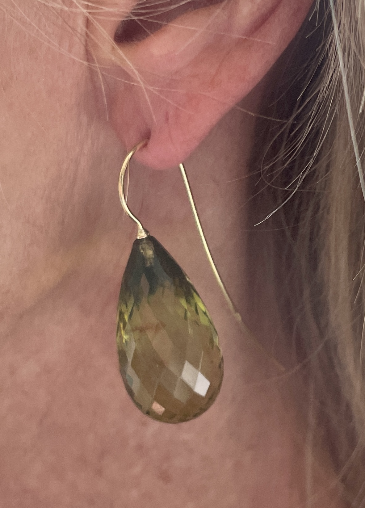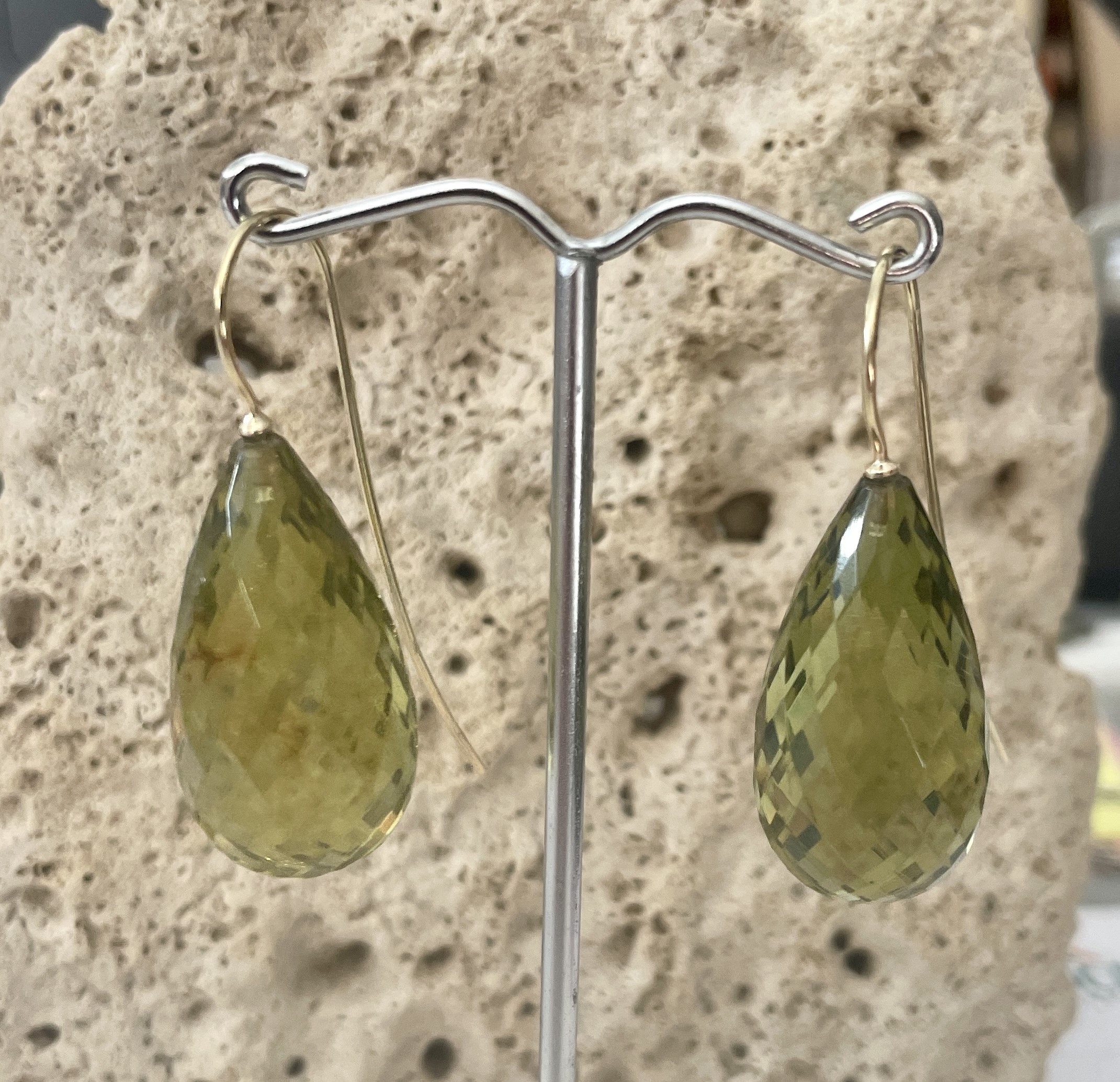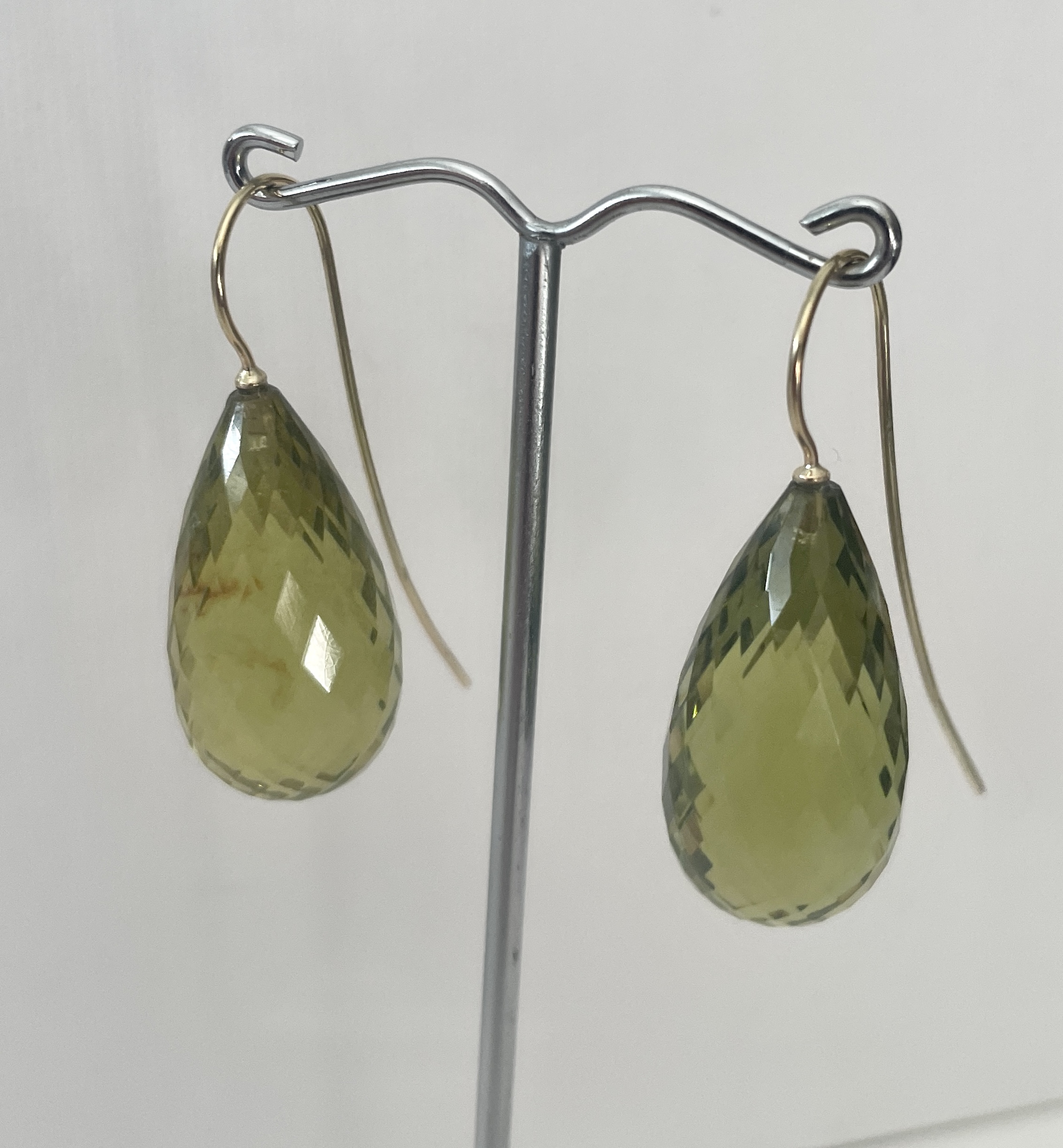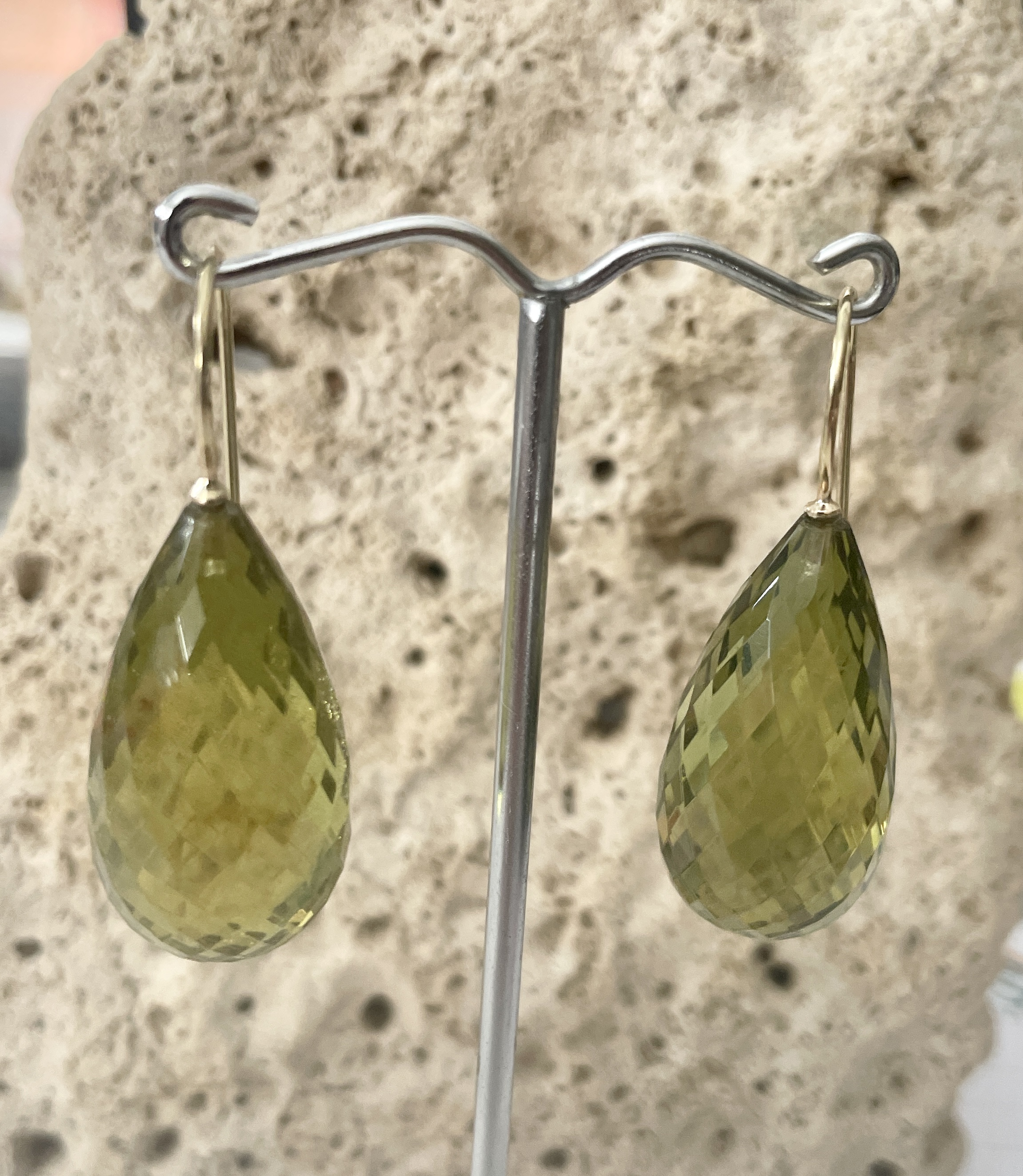 Die schicken Ohrhänger mit 585 Gelbgold verzaubern mit je einem leuchtenden grünen Bernstein. Die hinreißenden Steine in Pampelform wurden facettiert geschliffen, was ihre natürliche Brillanz noch unterstreicht. Das Besondere an diesen Ohrhängern sind die schönen langen Ohrhaken. und ein Gewicht von ca. 12,50 g.