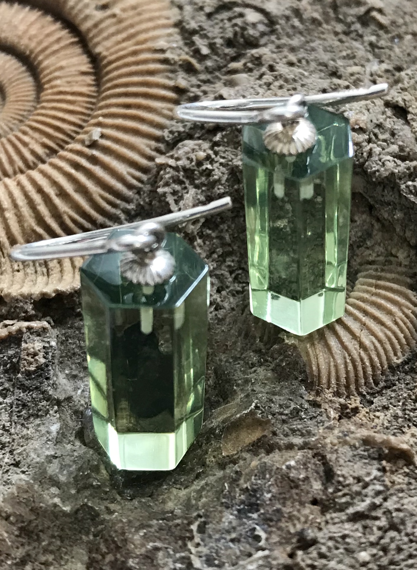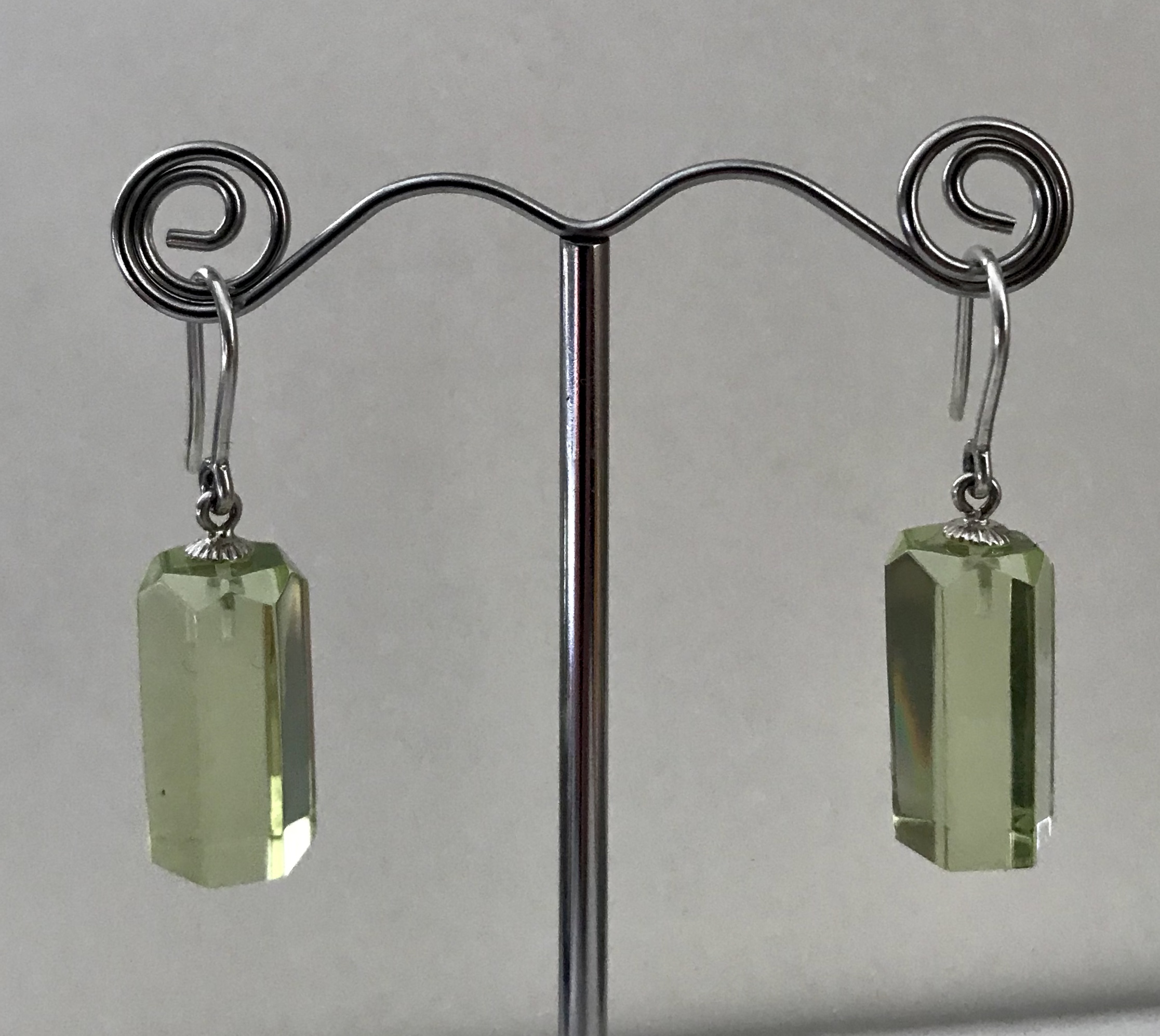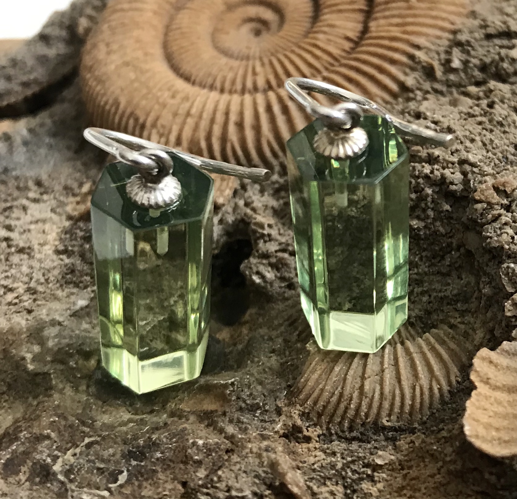 Besonders hübsche Ohrhänger aus 925er Sterlingsilber. Sie beeindrucken mit je einem funkelnden grünen Bernstein von 45 mm Gesamtlänge und einer Breite von 8 mm. Die strahlenden Steine wurden in 6eck Form facettiert, was ihren natürlichen Glanz noch um ein Vielfaches verstärkt.