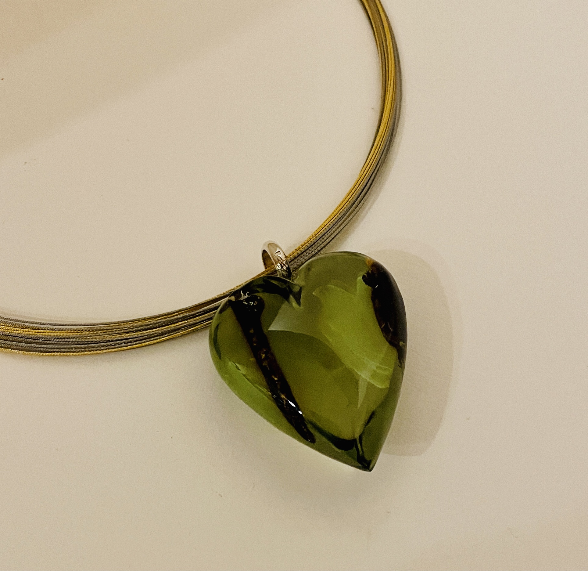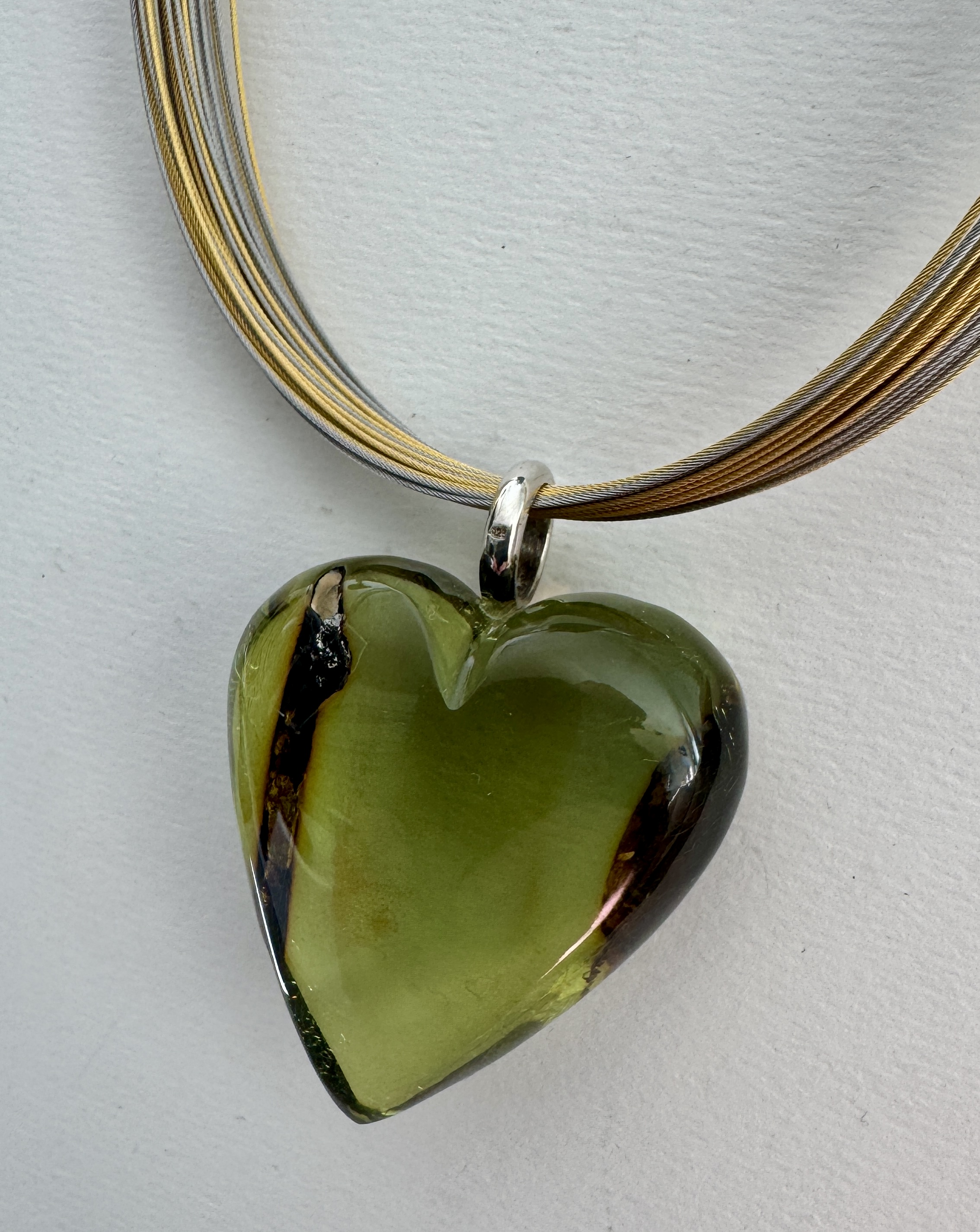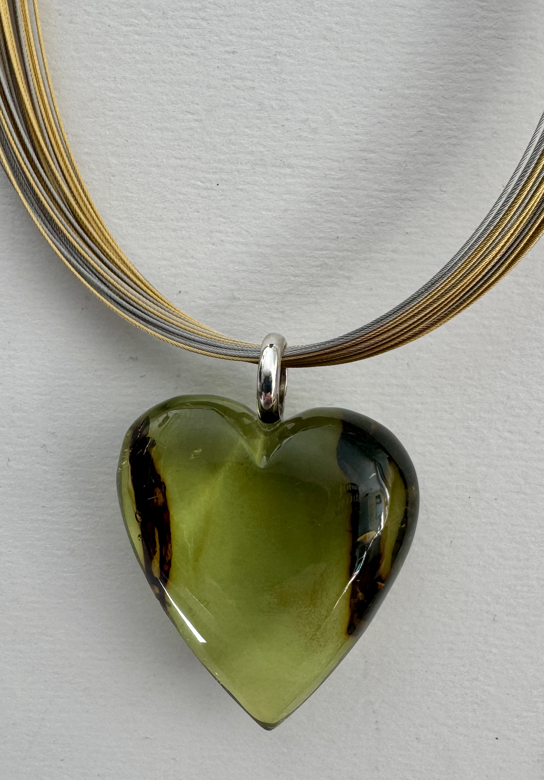 Einmalig schöner grüner Bernstein Anhänger in Herzform mit einer Schlaufe aus Silber 925.