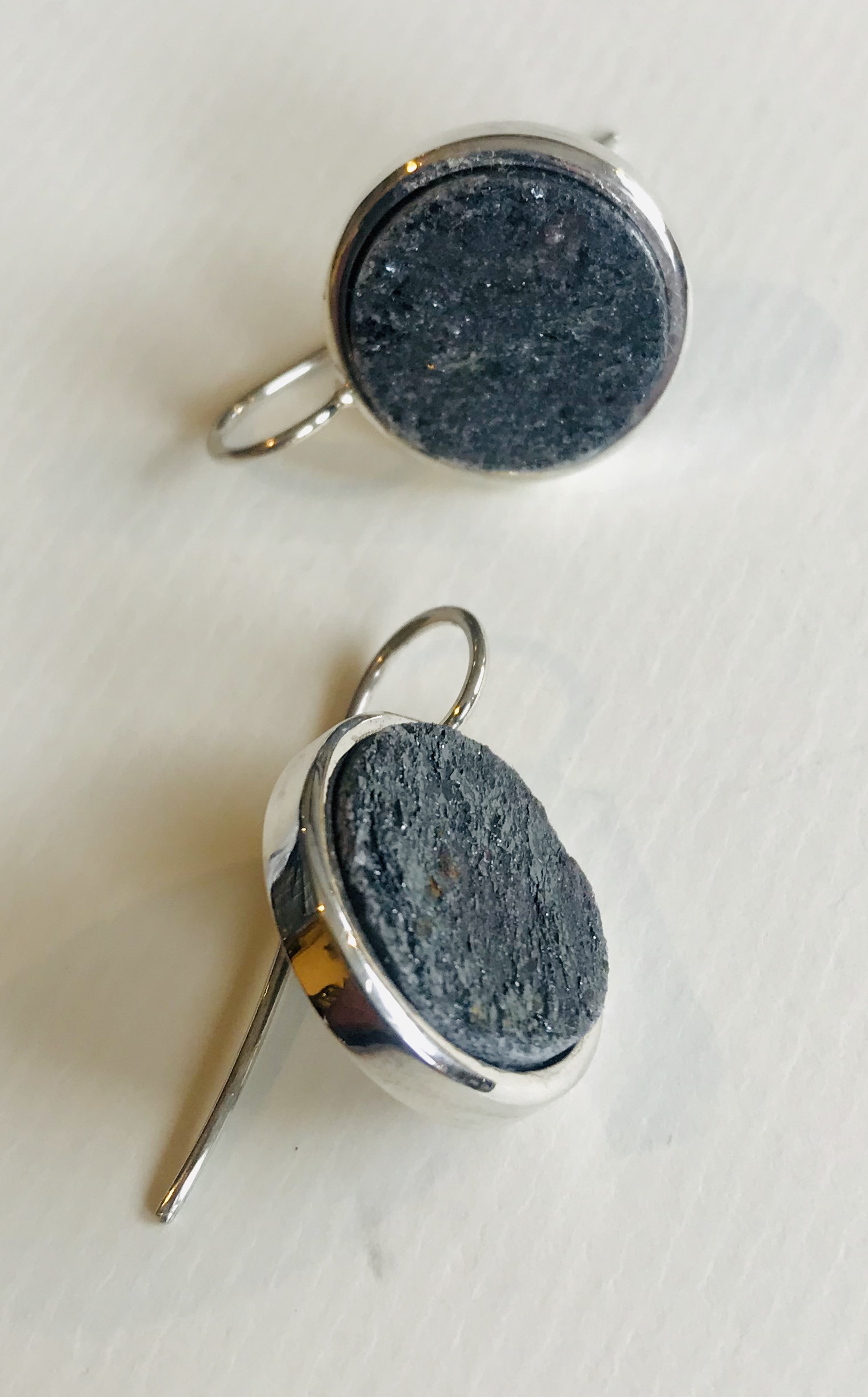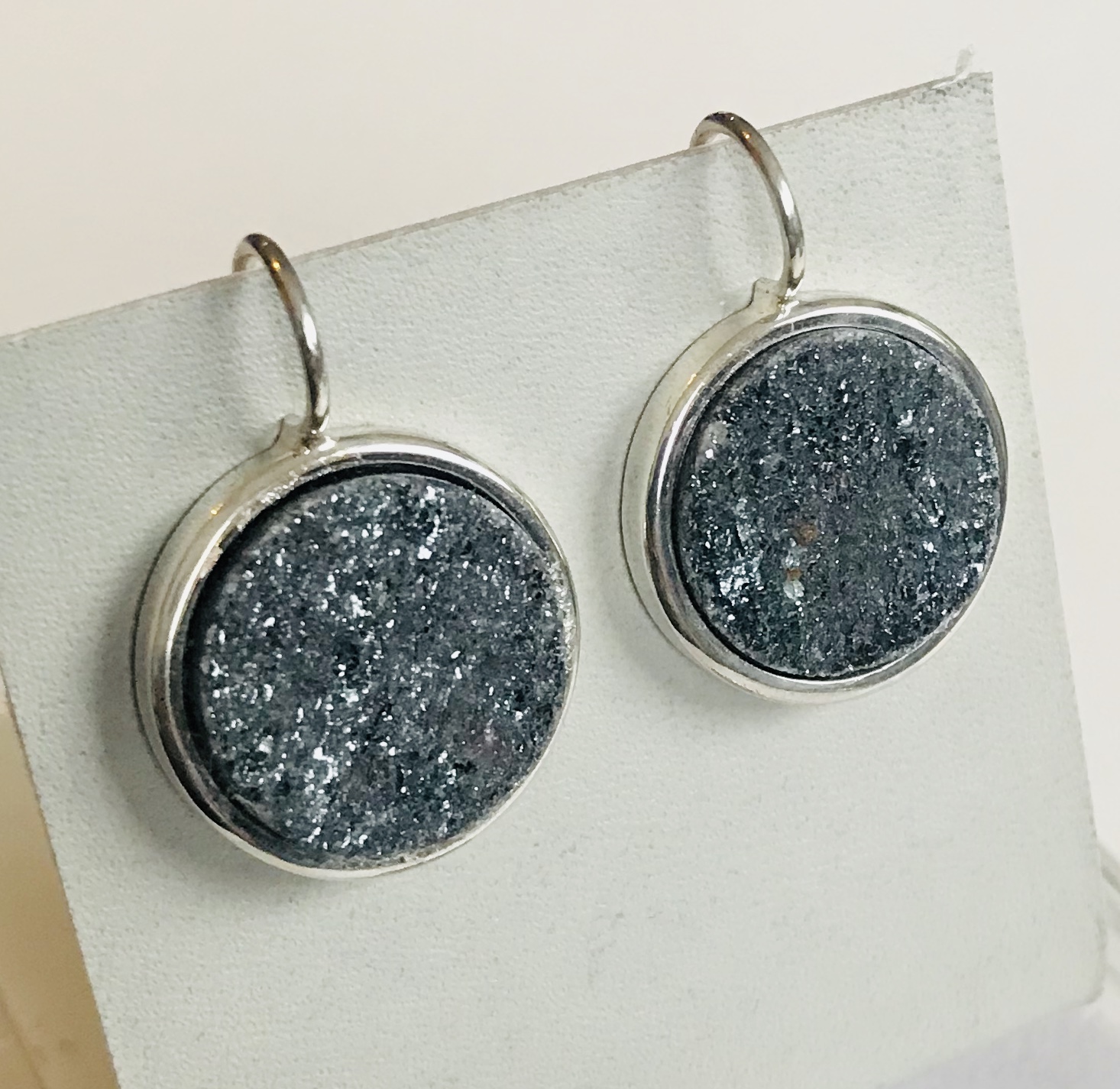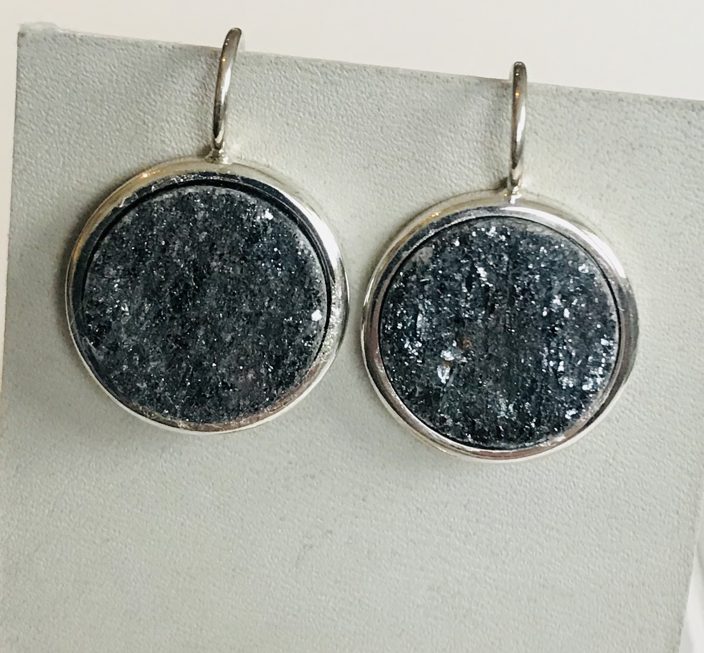 Größe Hämatit 16mm die Hänger insgesamt 19 mm. Der Silberhaken ist ca. 28 mm lang und starr an der Fassung angebracht.
