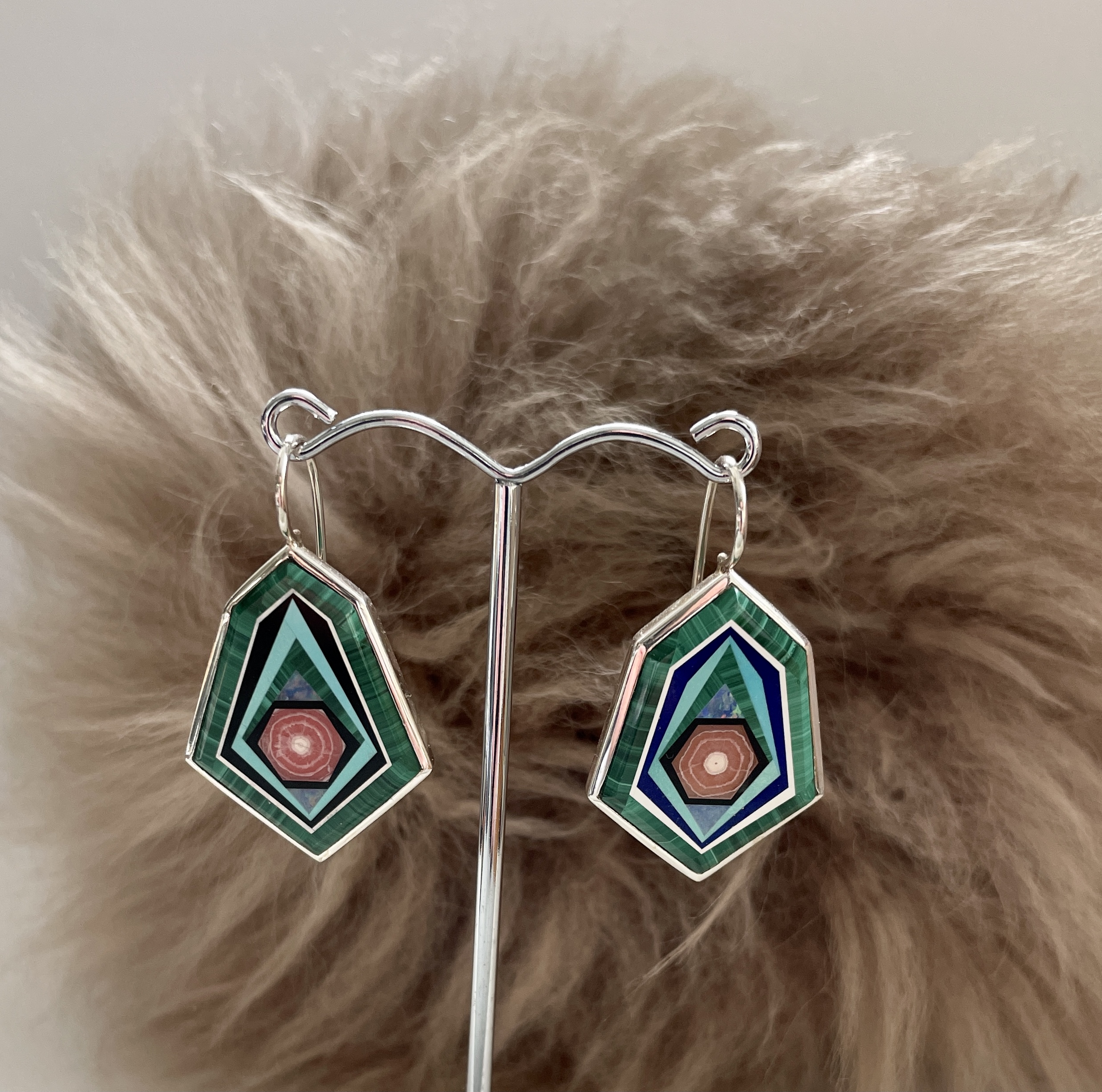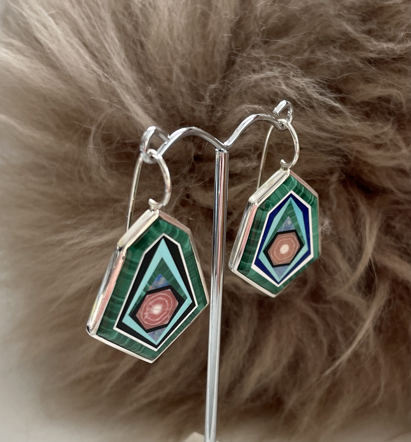 In liebevoller Handarbeit wurden diese außergewöhnlichen Ohrhänger aus verschiedenen Edelsteinen wie z. B.: Malachit, Opal, Onyx, Rhodocrosit, Perlmutt und Türkis geschliffen und bis zur Vollendung ausgearbeitet und in Silberfassungen gefügt. Praktikable Ohrhaken optimieren diese Schmuckstücke.