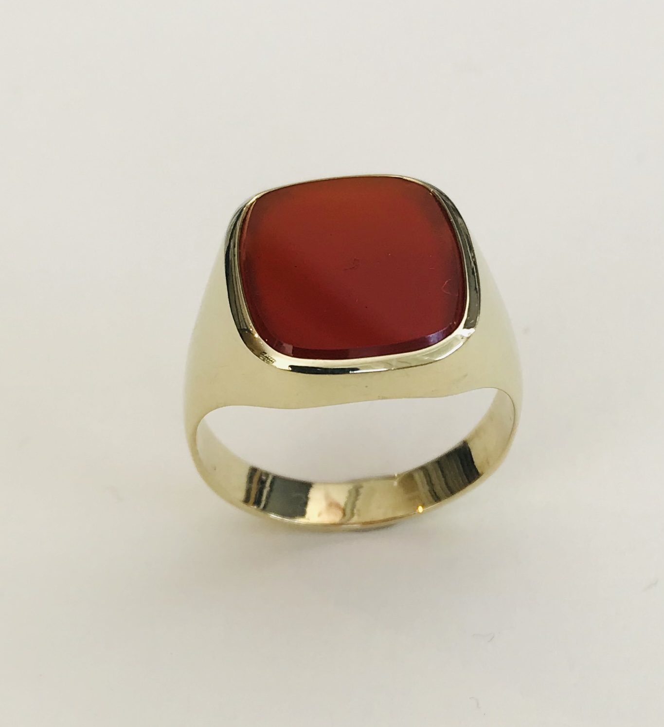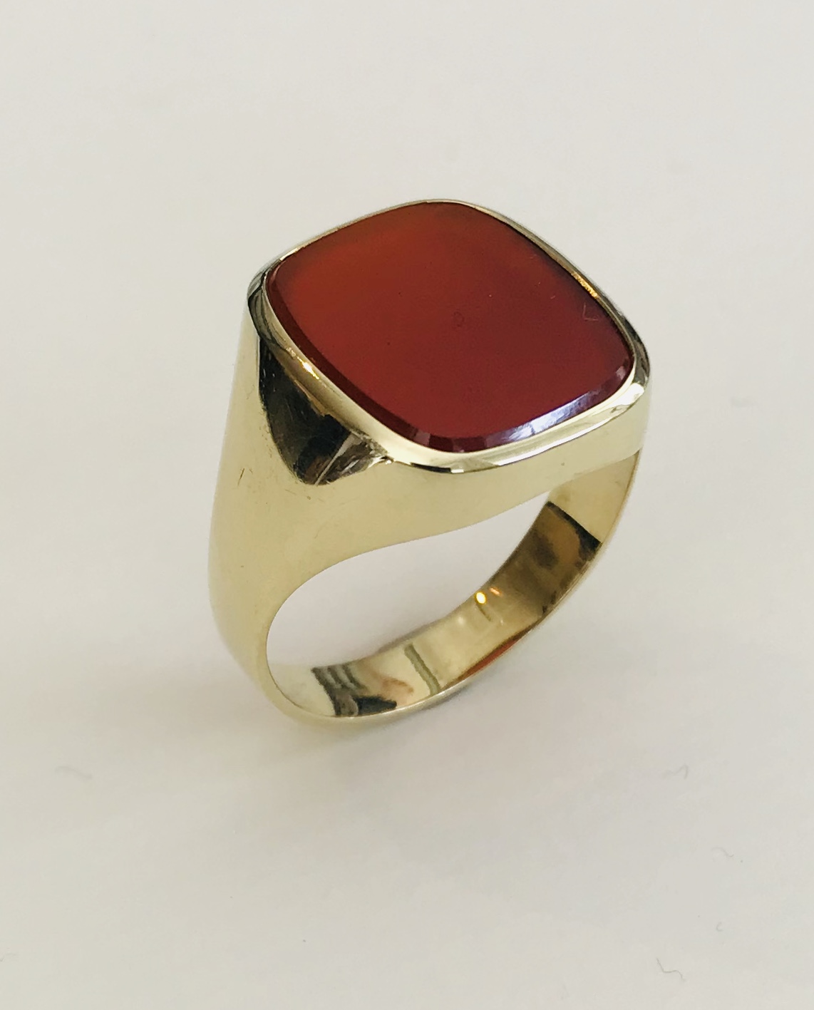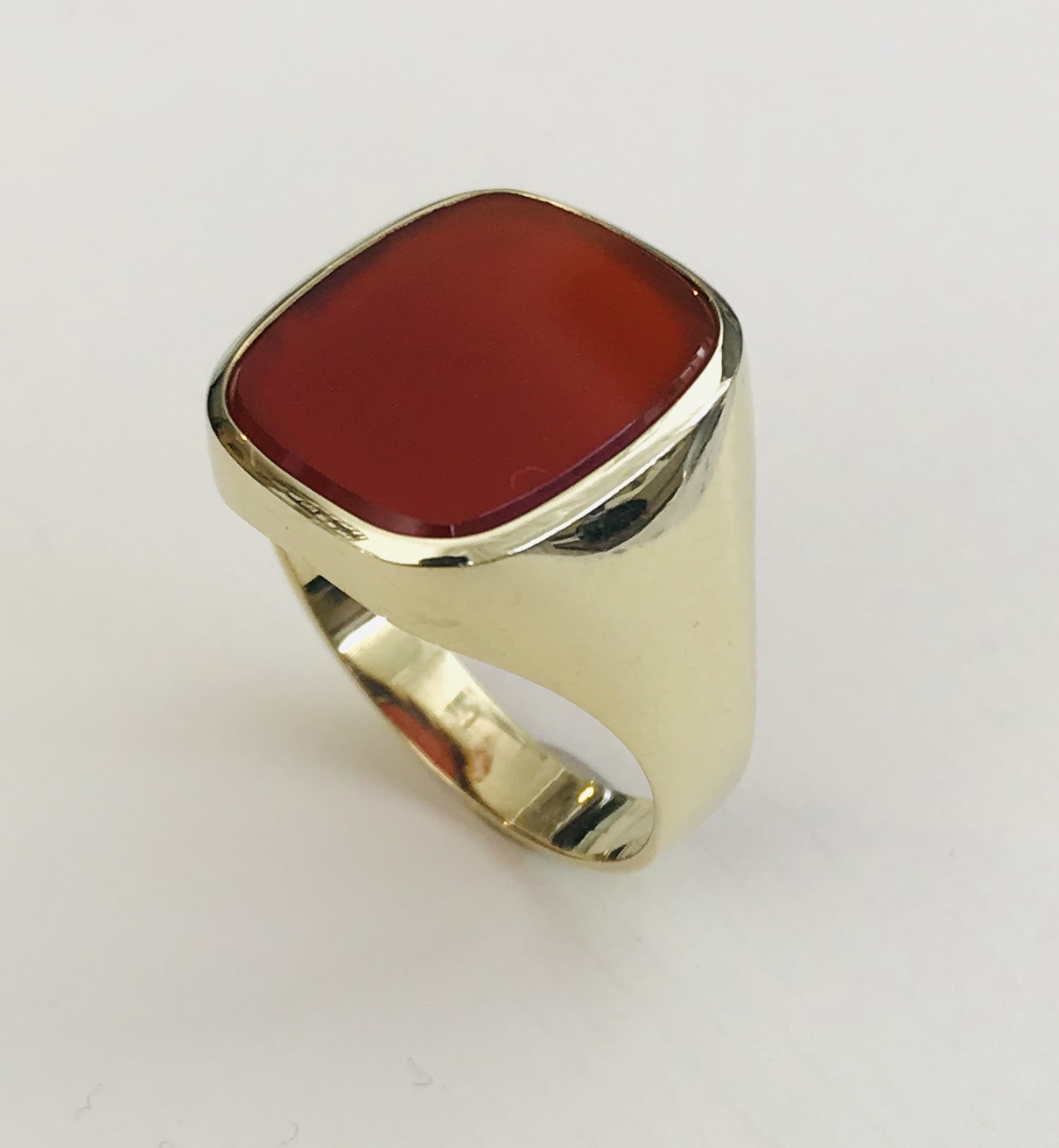 Der antik geschliffene Karneol hat eine Größe von ca. 16 x 13 mm. Die Oberfläche des Edelsteinsteins hat eine sehr schöne ins Organe gehende