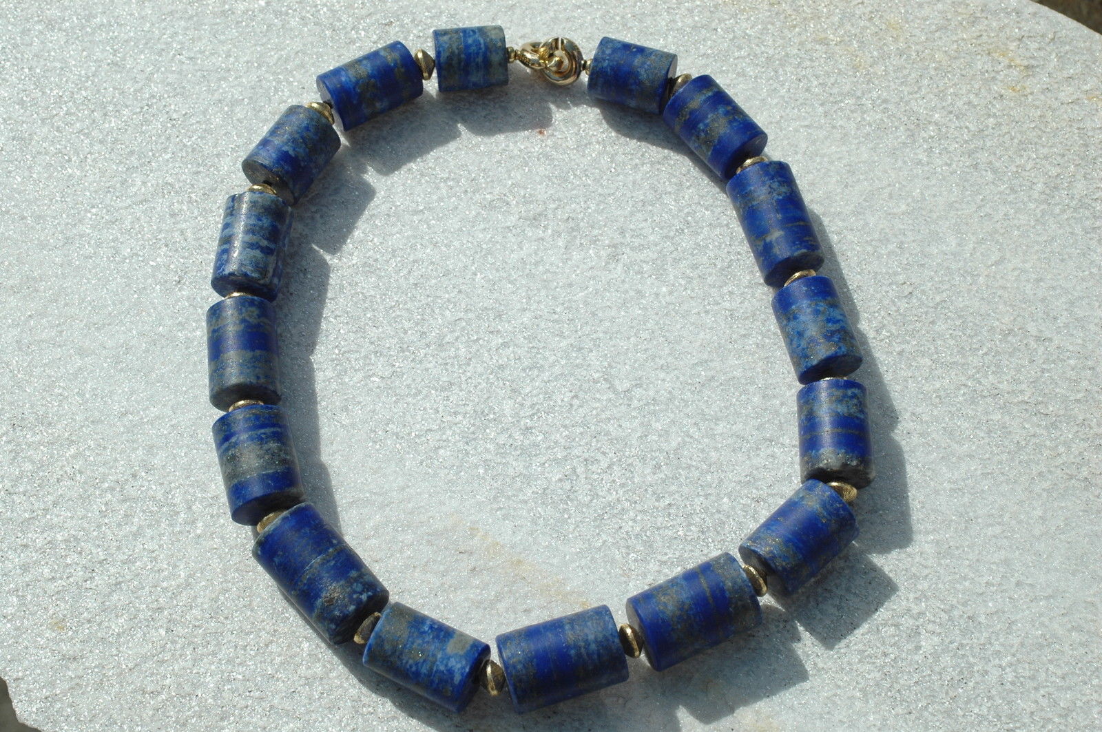 Zeitlos und moderne Kette aus ausdrucksstarken Lapislazuli Elementen in Walzenform mit der Größe von ca. 24x16 mm. Die eingearbeiteten Silberteile sind vergoldet, sowie der praktische Verschluss zum Einhaken. Dieser hübsche Halsschmuck hat eine Länge von ca. 48 cm.