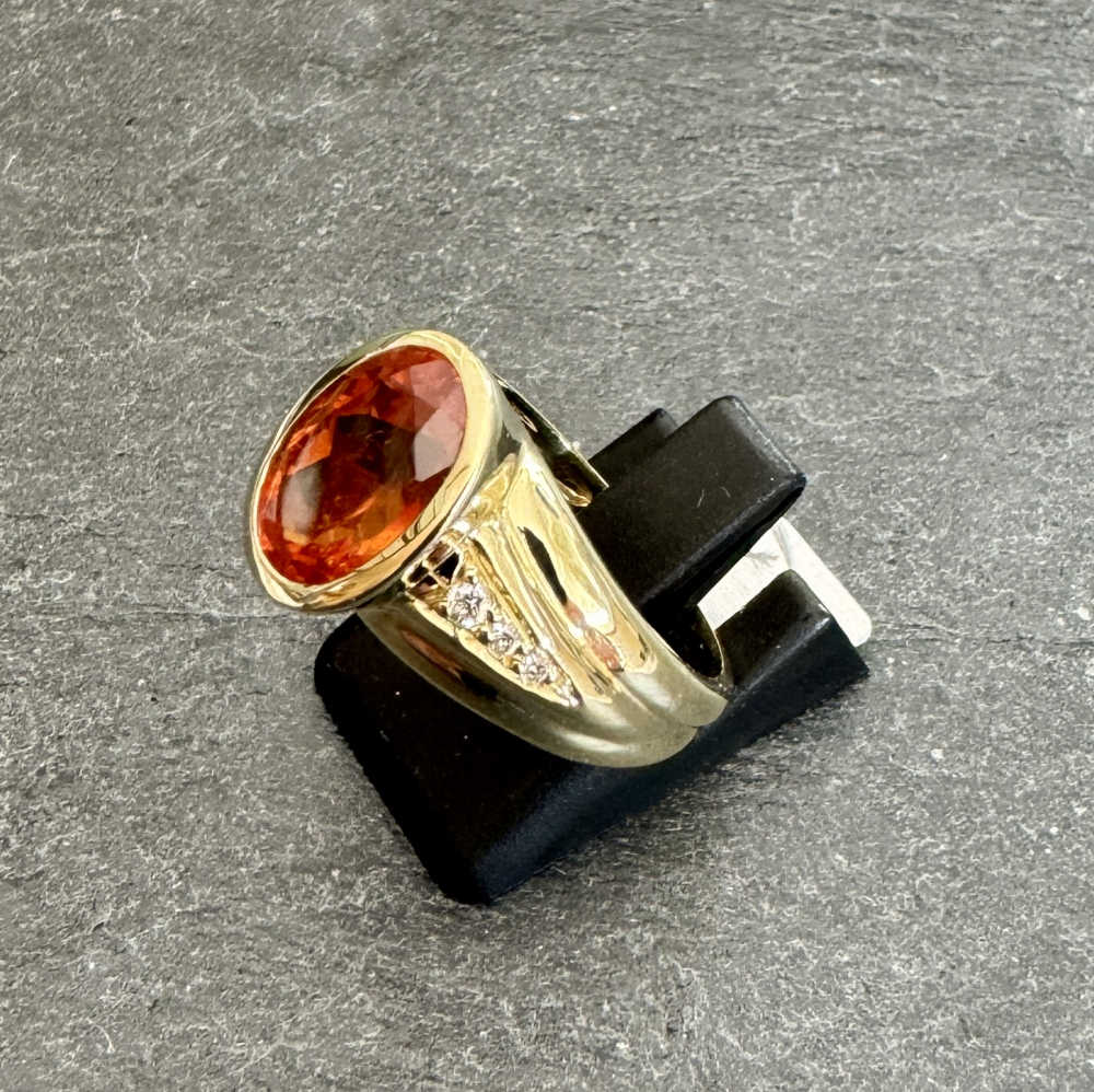 Auserlesener, feiner Mandarin - Granat Ring 585 Gelbgold, eingerahmt von 6 strahlenden Brillanten mit ca. 0,09ct im edlem Schliff und sehr guter Brillanz. Der feine Mandarin - Granat in leuchtendem Orange hat ein Gewicht von ca. 4,66 ct und eine Größe von ca. 10 x 8mm Oval.