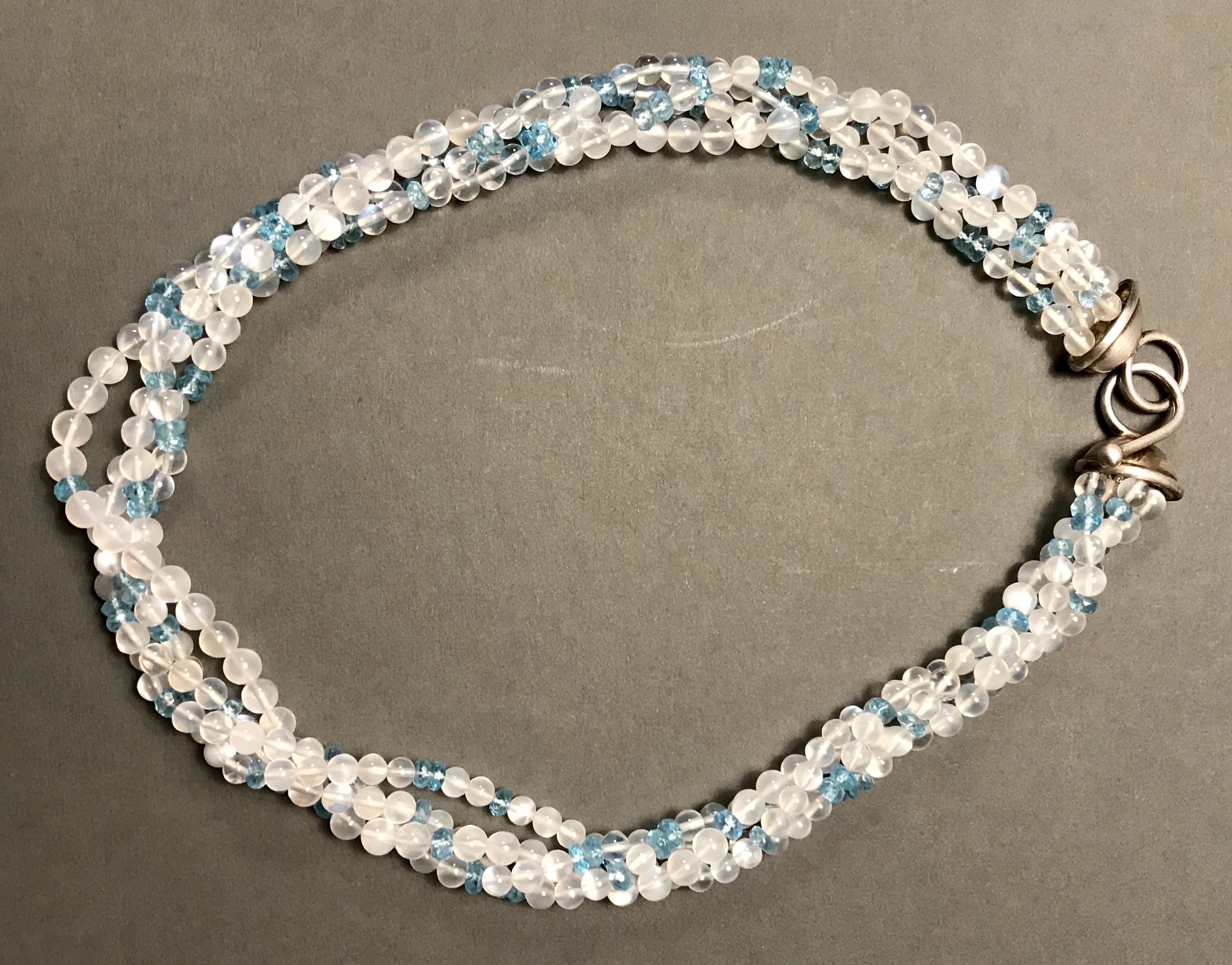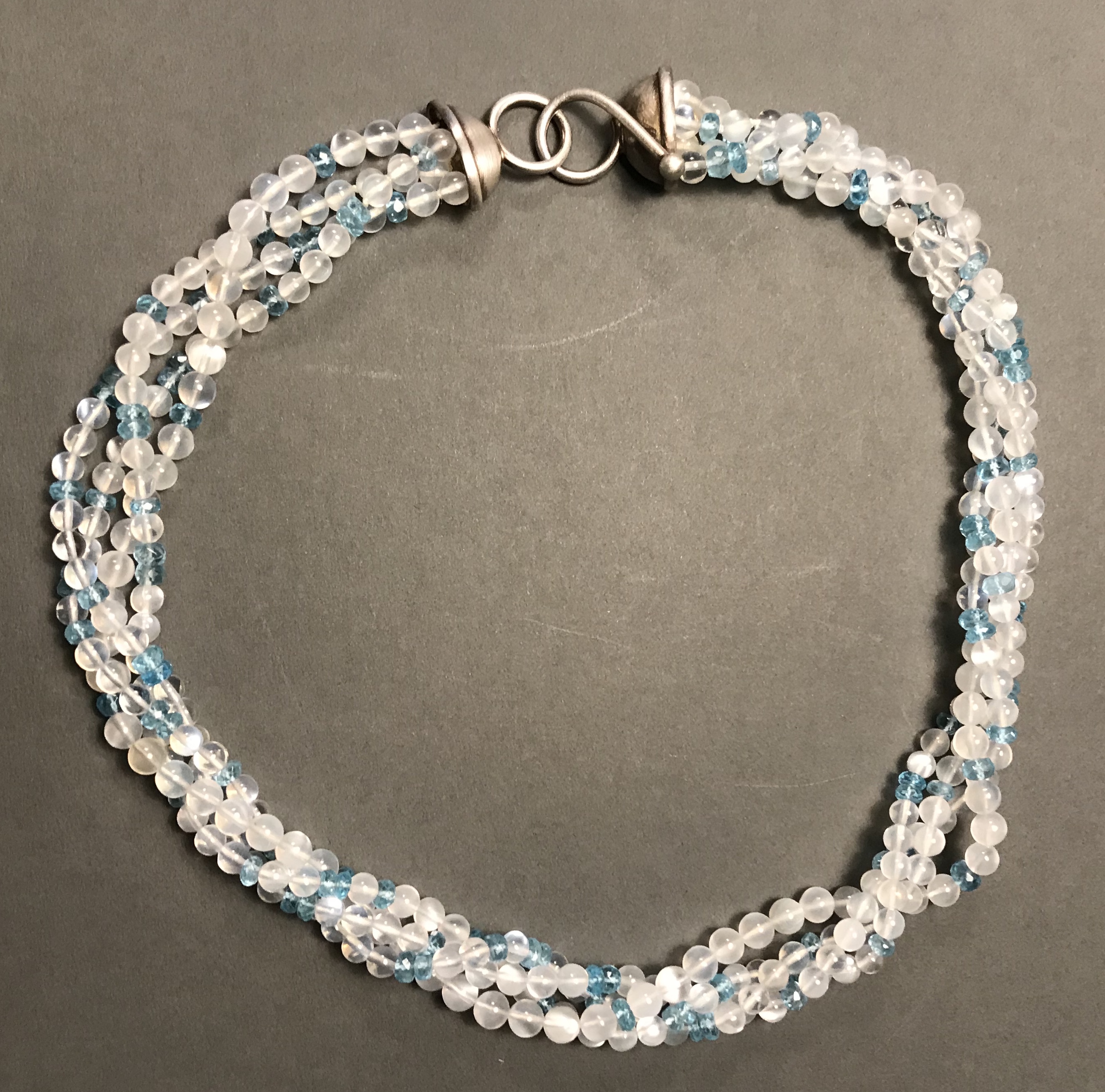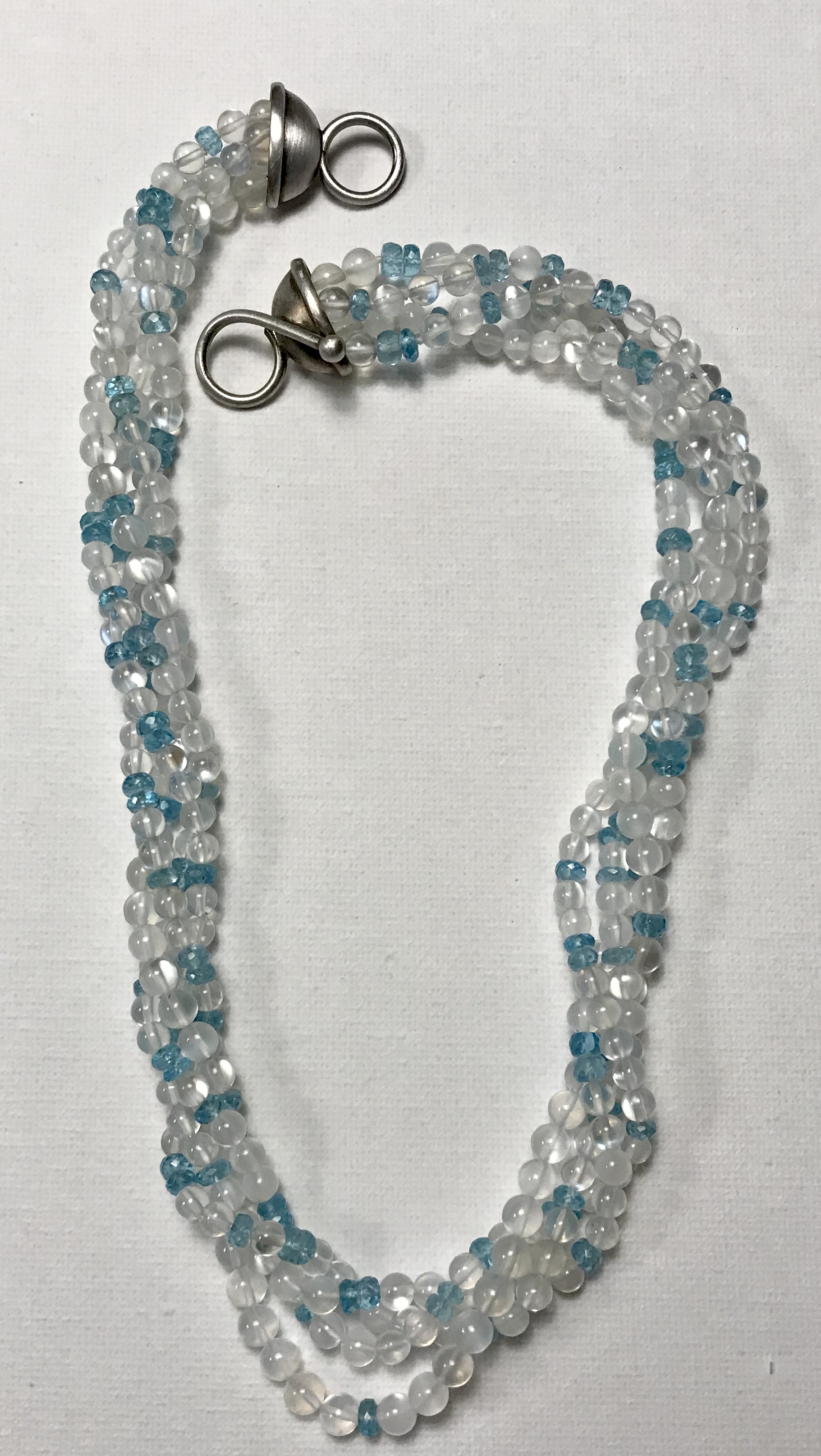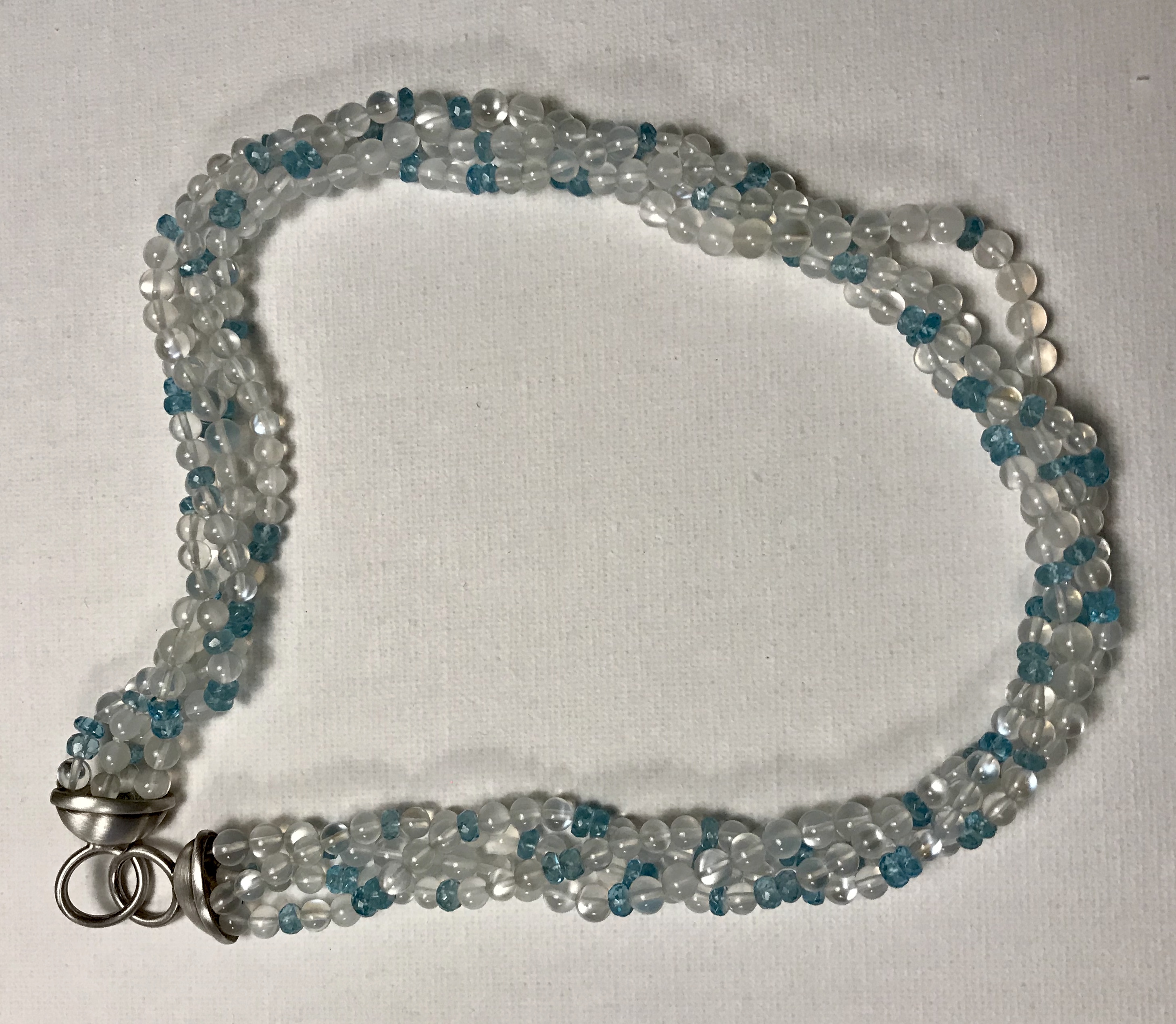 Das hinreißende 4reihige Collier besteht aus zahlreichen Ceylon Mondsteinkugeln mit einzeln aufgefädelten, stimmig dazu passedenen Apatitkugeln. Die Mondsteinkugeln haben eine Größe von 5 - 6,5 mm eine echte Rarität in dieser Qualität. Das Collier hat ein Länge von 46cm. Begehrenswert und sensationell ist der Schimmer an Ihrem Dekolleté. Der dienliche Silberhakenverschluss rundet dieses Schmuckstück ab.