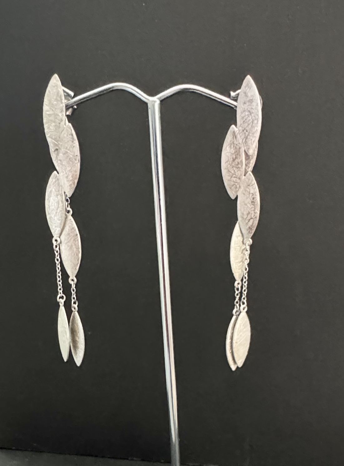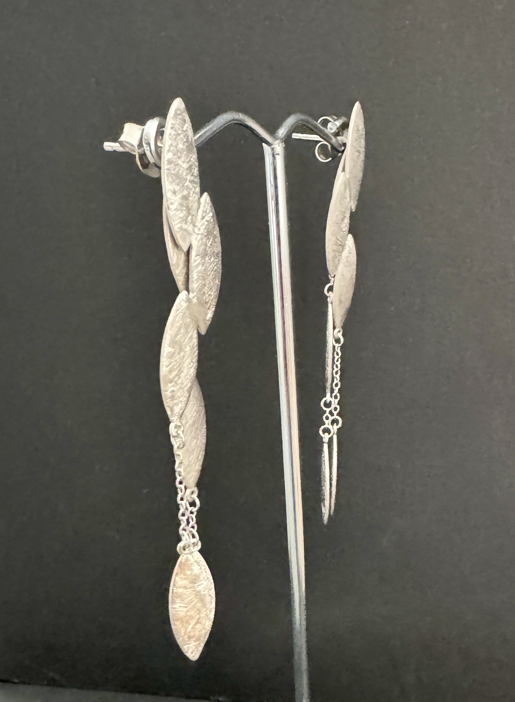 Die eismattierten navettförmigen Silberteile sind mit Kettenstücken zusammen gefügt.