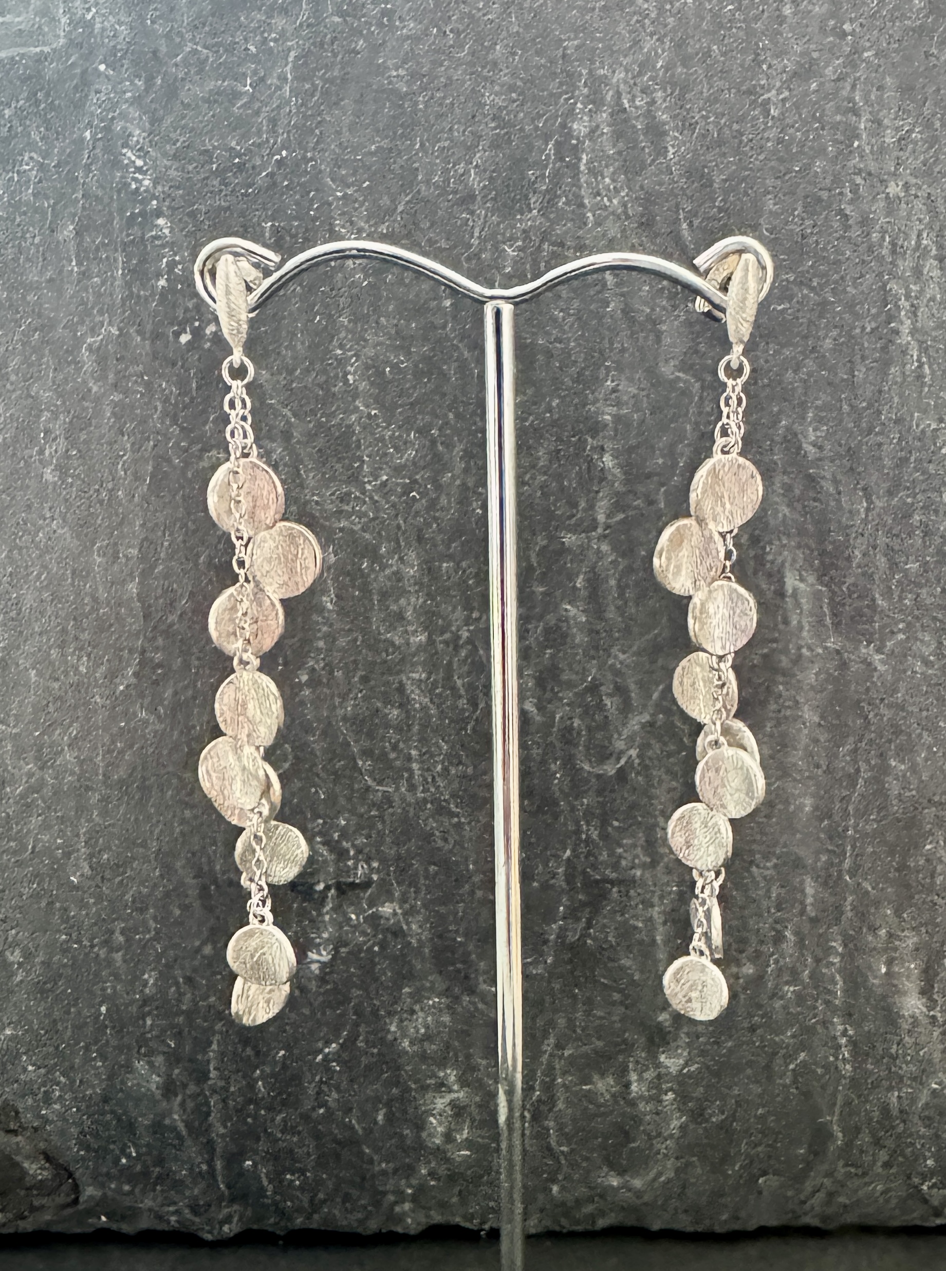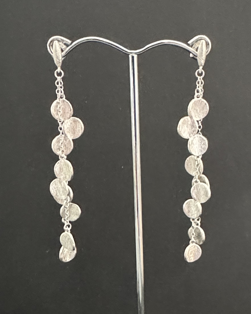 Die eismattierten runden Silberteile sind mit Kettenstücken zusammen gefügt.