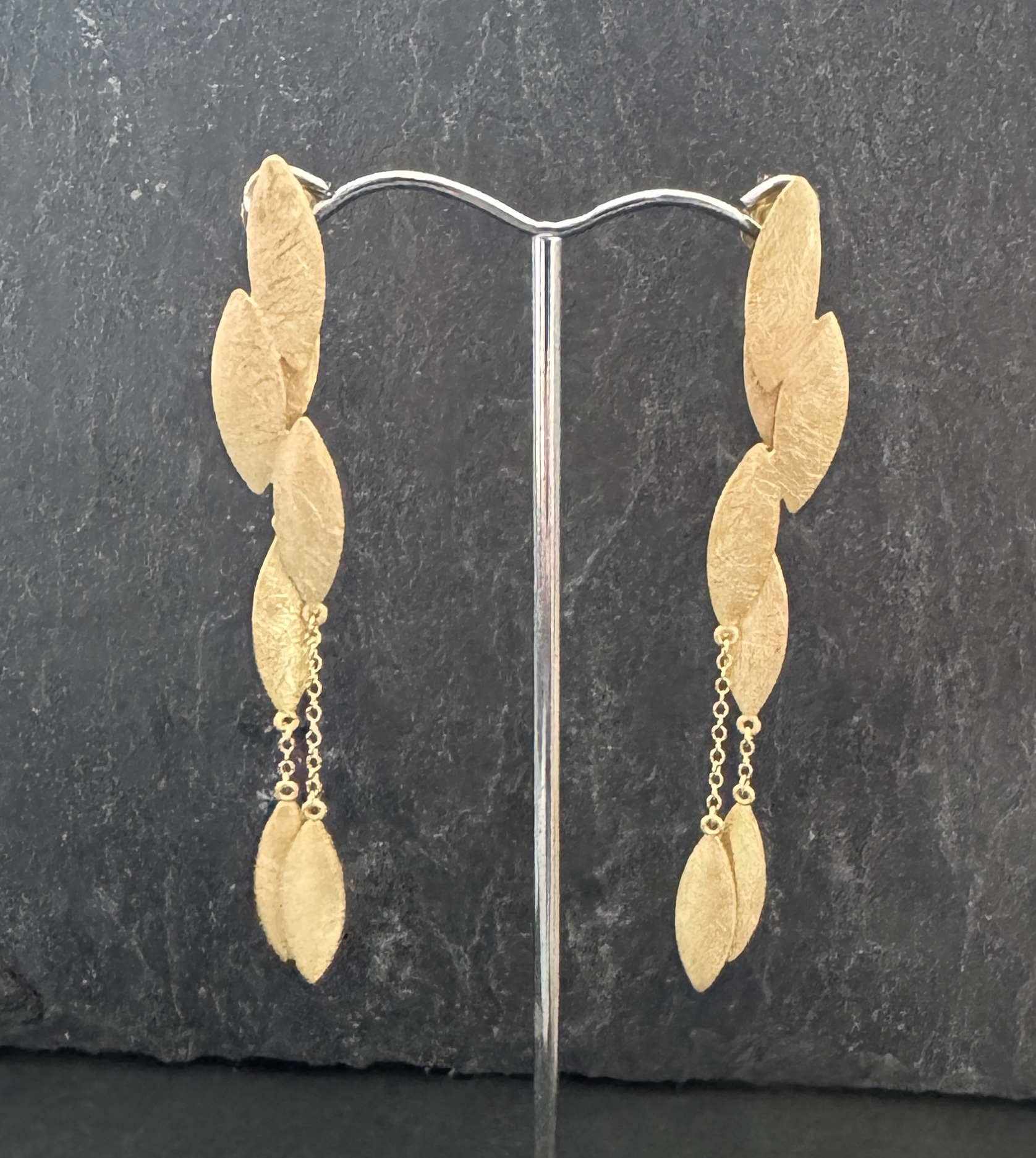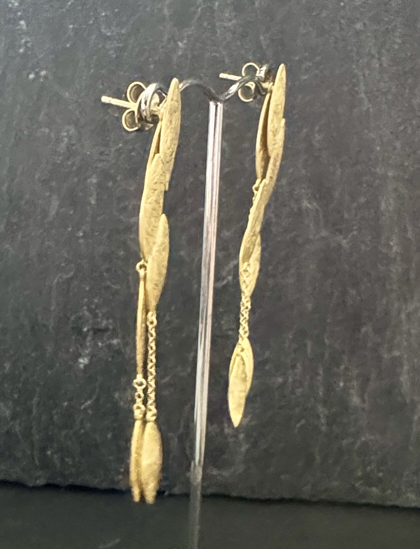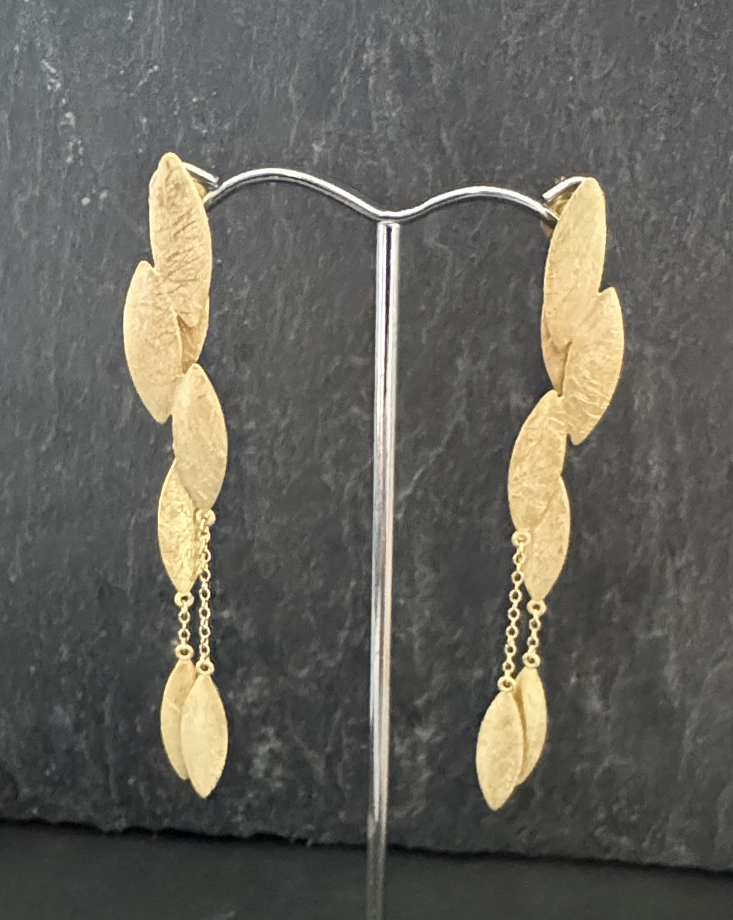Die eismattierten navettförmigen Silberteile vergoldet sind mit Kettenstücken zusammen gefügt.