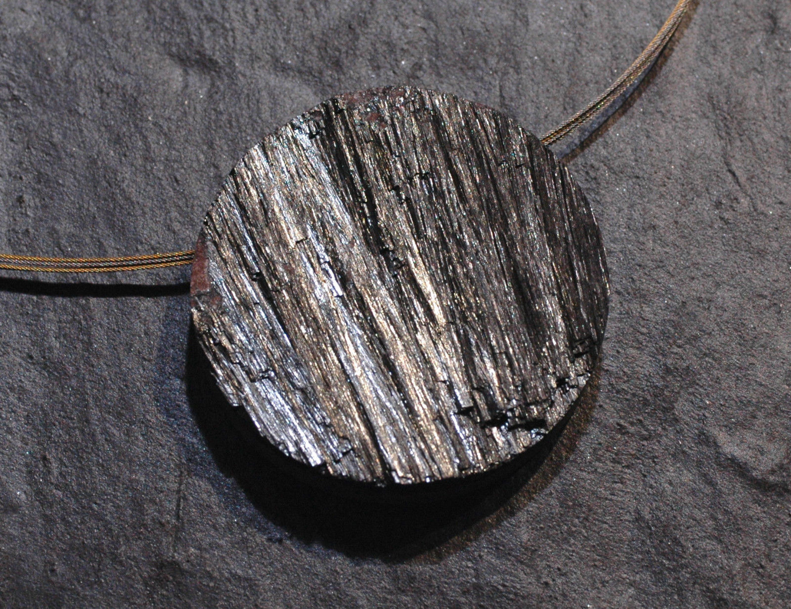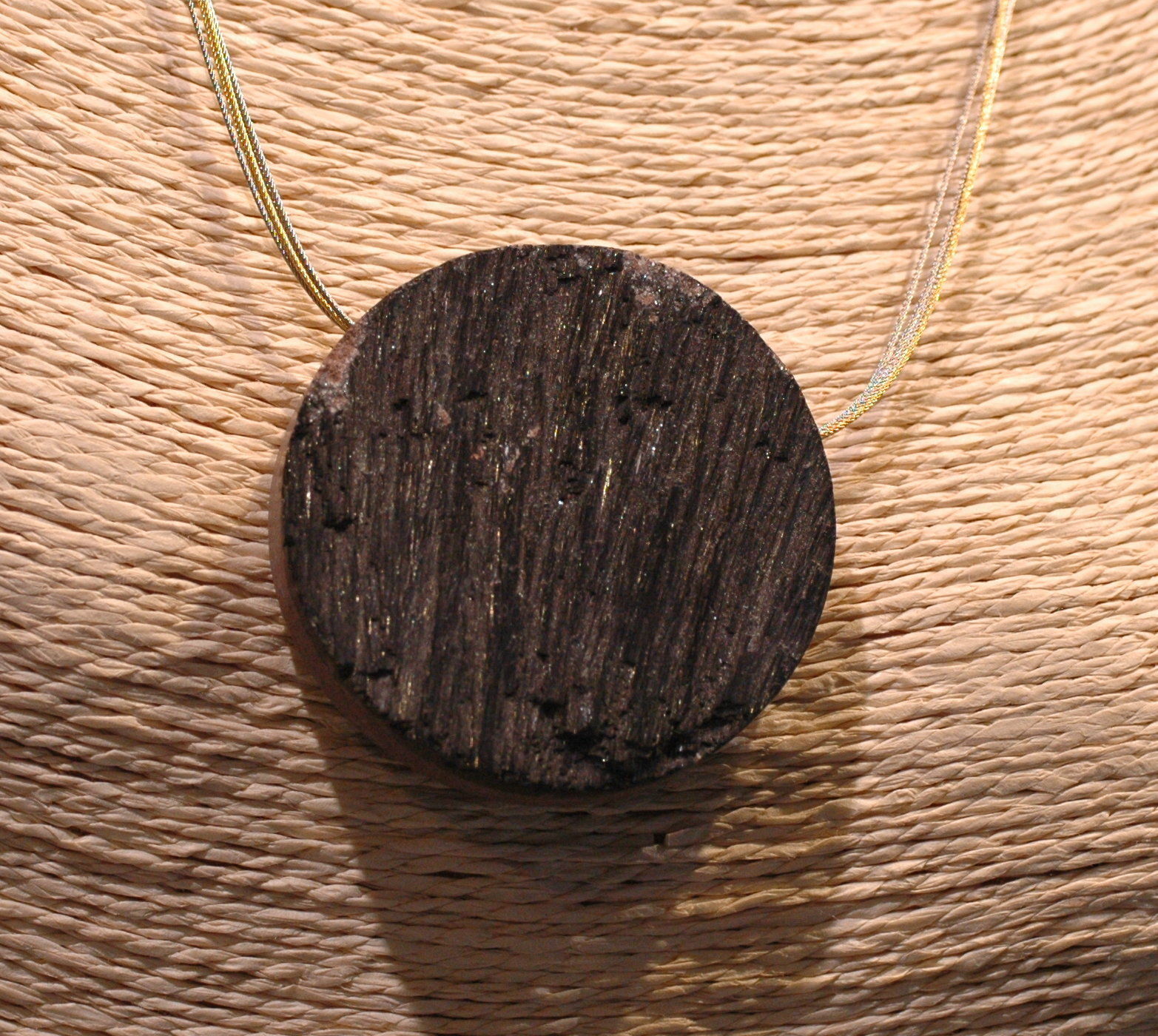 Ausdrucksstarker Pyrolosit-Anhänger und dazu passendes Edelstahlband mit 5 Seilen im angesagten multicolor Look. Der gebohrte Anhänger ist auf der Vorderseite von Natur kristallisiert. Er hat die Größe von ca. 5,3 cm und einem Gewicht von ca. 67 g. Die Kette ist ca. 42 cm lang und durch den neuartigen Klippverschluss super einfach zu öffnen und zu schließen.