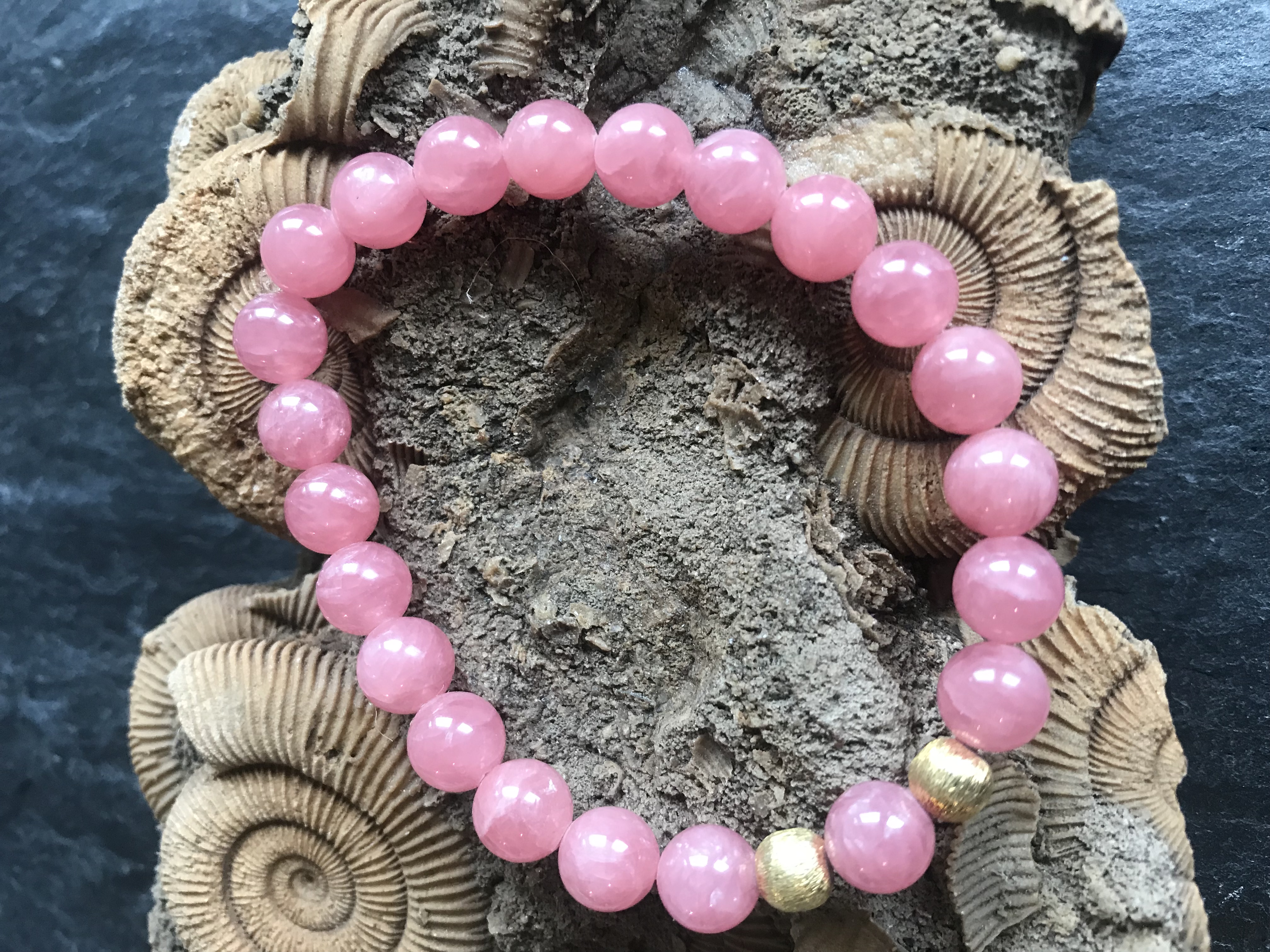 Das hinreißende Armband besteht aus zahlreichen, leuchtenden Rhodocrosit Kugeln in denen sich die verschiedenen Rosatöne spiegeln. Auf ein strapazierfähiges Gummiband aufgefädelt, schmiegt sich diese hübsche Schmuckstück um Ihr Handgelenk.