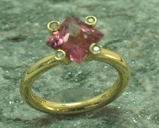 Zeitlos schön und elegant zeigt sich dieser Goldring mit einem facettenreichen, rosafarbenen Turmalin in 8mm Carreform.
