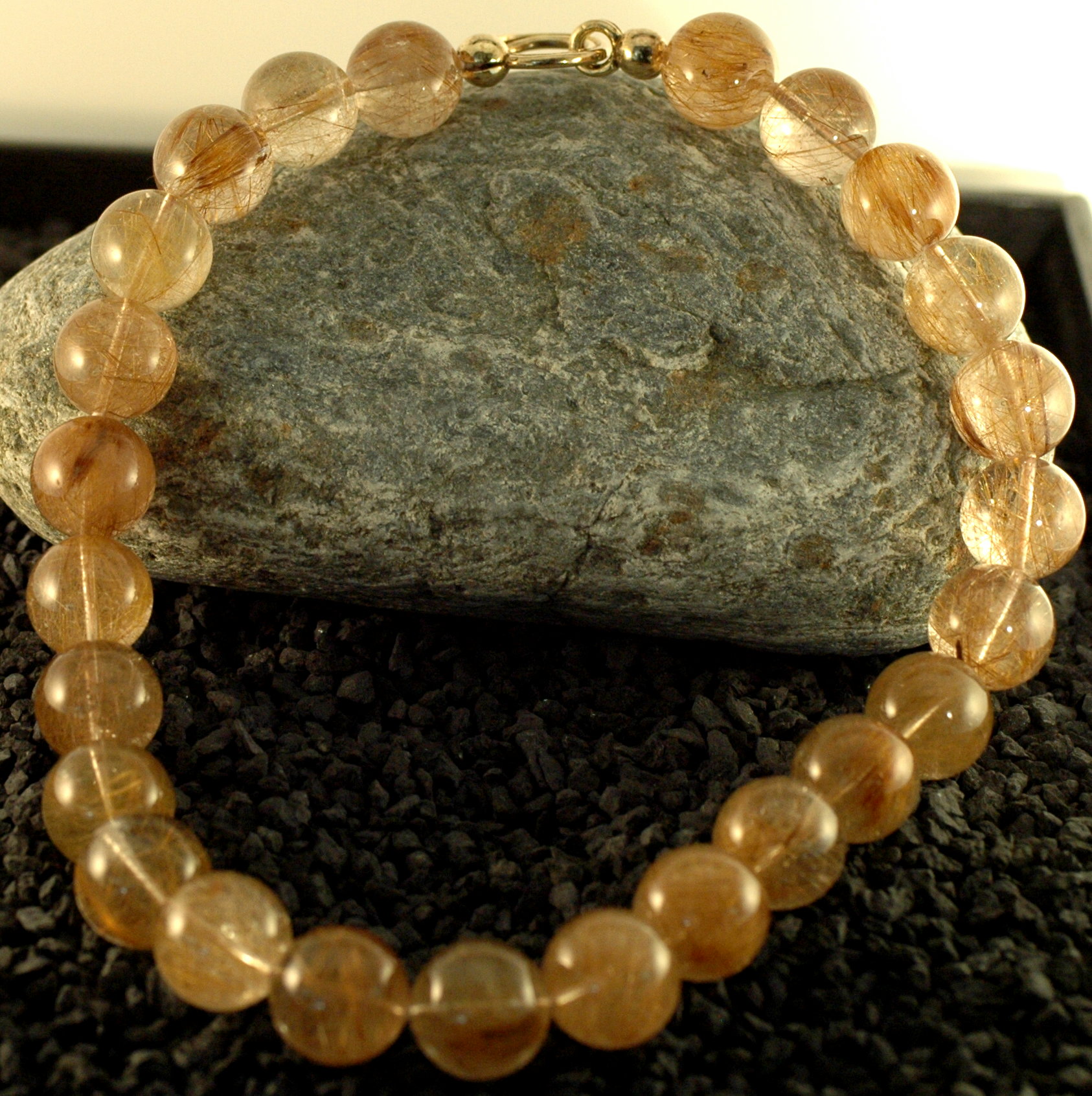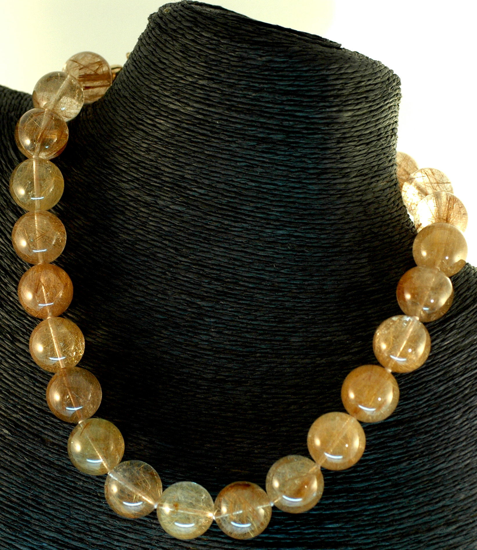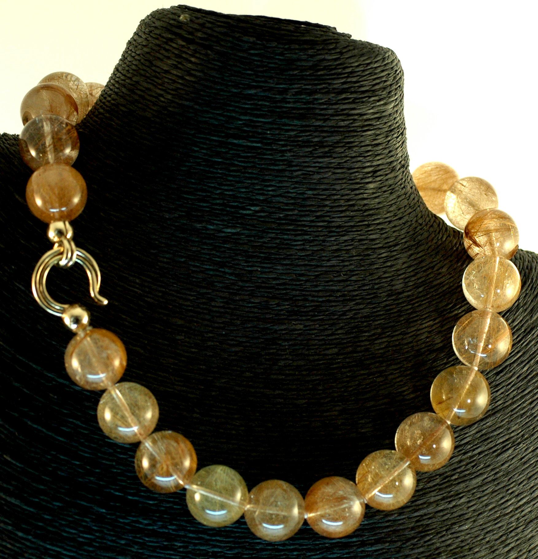 Das hinreißende Collier besteht aus zahlreichen leuchtenden Rutilquarzkugeln, in denen funkelnde, goldene Rutilnadeln strahlen. Ausgestattet mit einem massiven, vergoldeten Silberhaken als praktischer Verschluss. Dieses Schmuckstück wird Sie immer wieder aufs Neue begeistern.