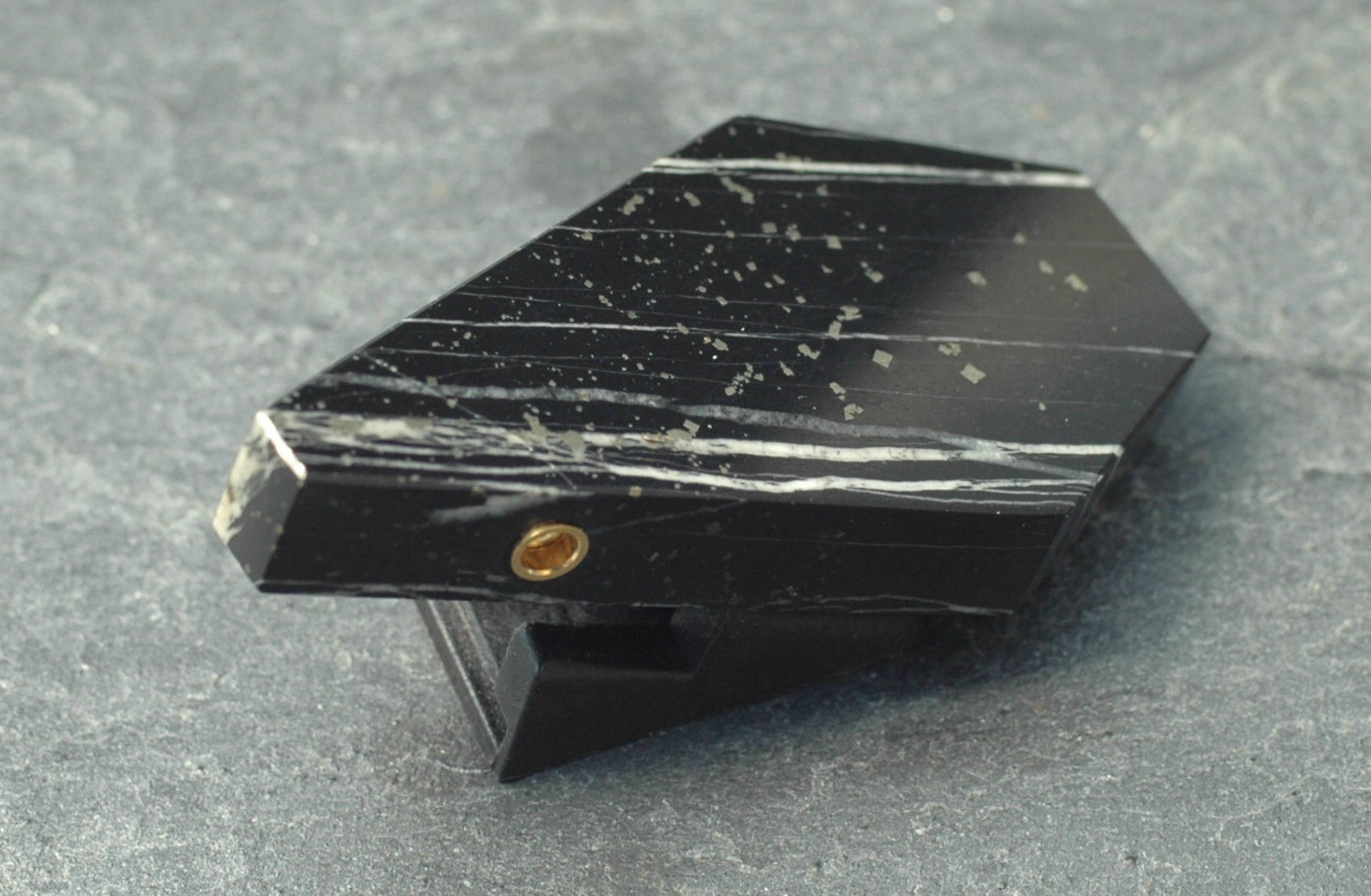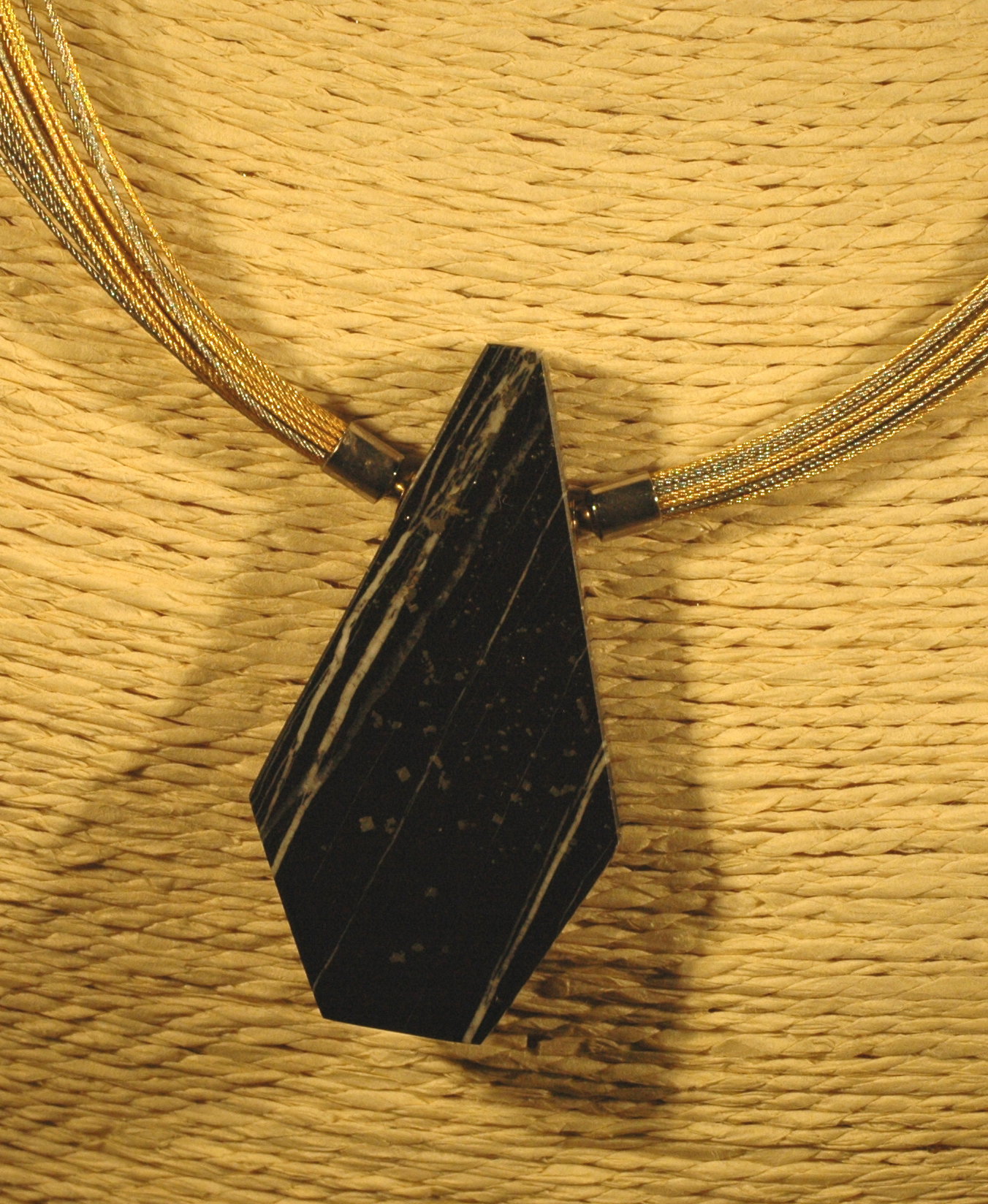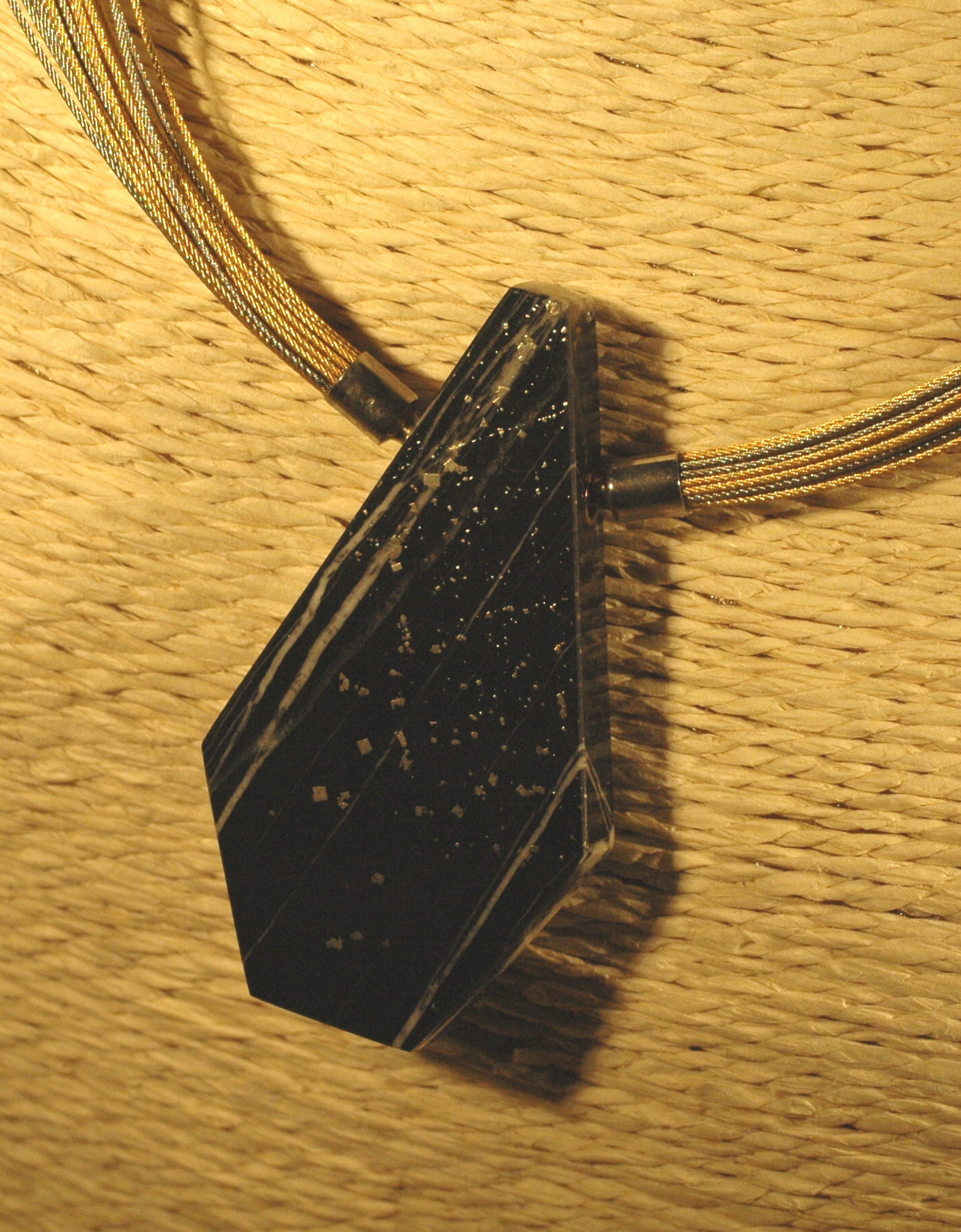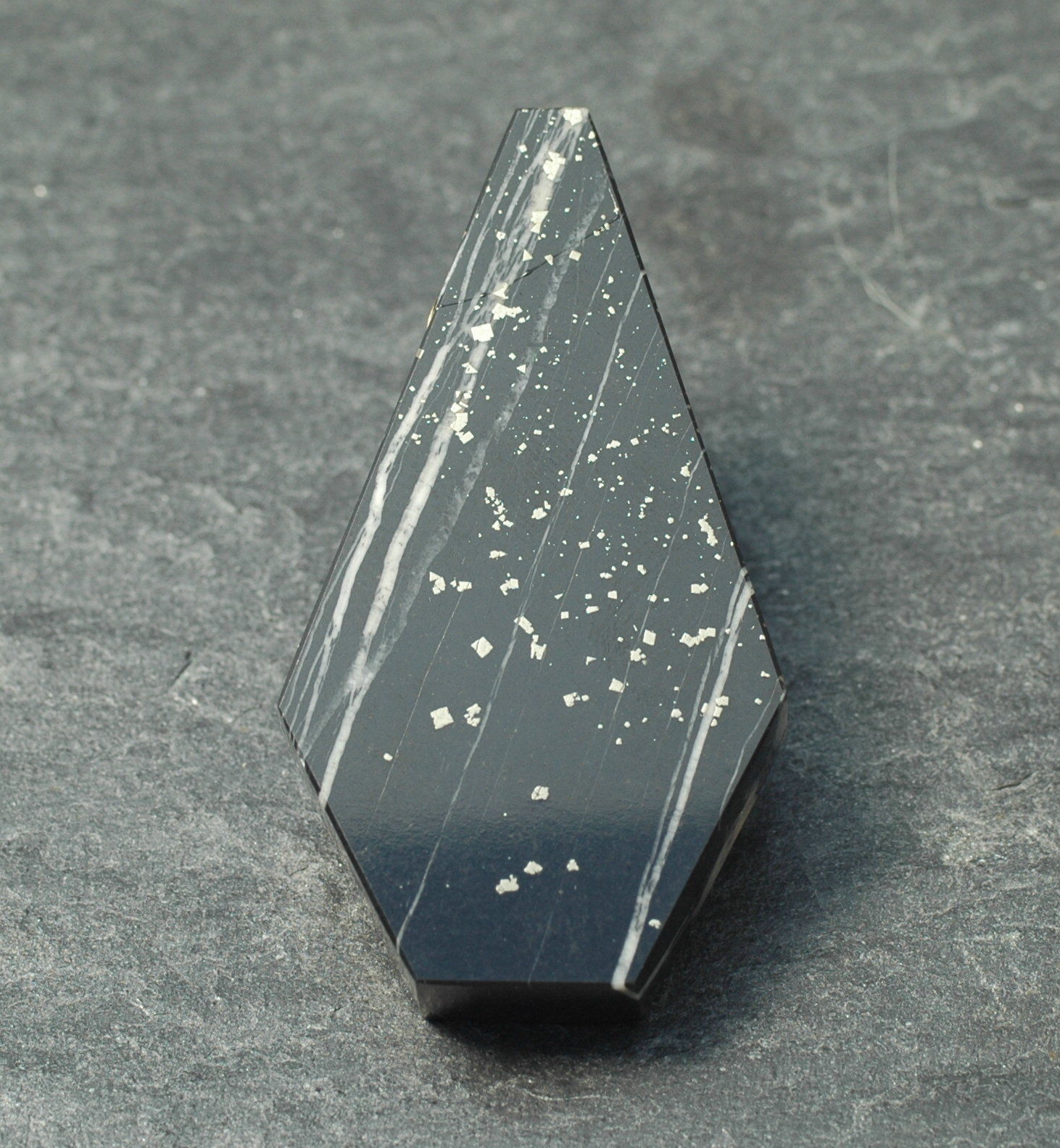 Toller Schiefer-Pyrit Anhänger in länglichem Sechseck geschliffen, mit schönem metallischem Schimmer.