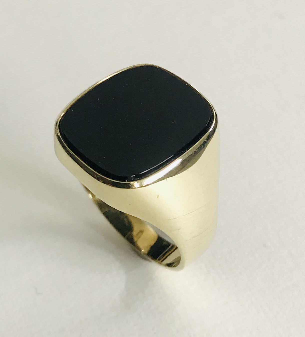 Der antik geschliffene Onyx hat eine Größe von 16 x 14 mm. Die Oberfläche des Edelsteinsteins, besticht durch sein tiefes Schwarz.