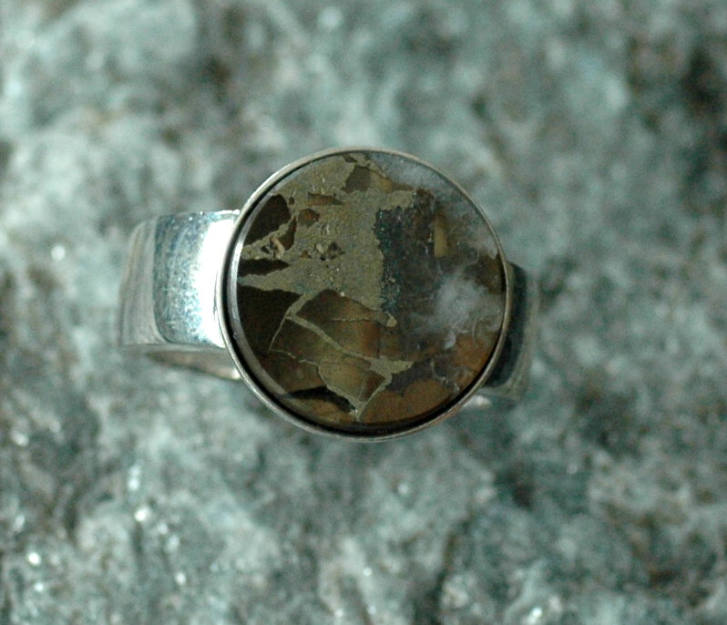 Das rund geschliffene Septarie mit Pyrit hat eine Größe von 15 mm. Die Oberfläche des Edelsteins besticht durch seine atemberaubende Struktur.