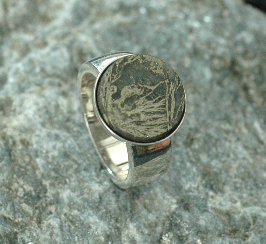 Der rund geschliffene Federpyrit hat eine Größe von 15 mm. Die Oberfläche des Edelsteins besticht durch seine atemberaubende Struktur.