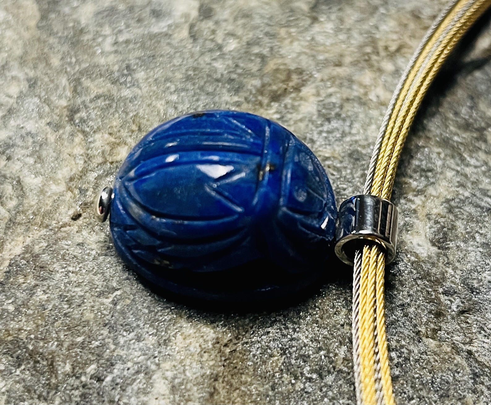 Der prächtige Skarabäus hat ein sehr intensives blau mit kleinen Pyrit Einschlüssen und ist von Hand graviert.