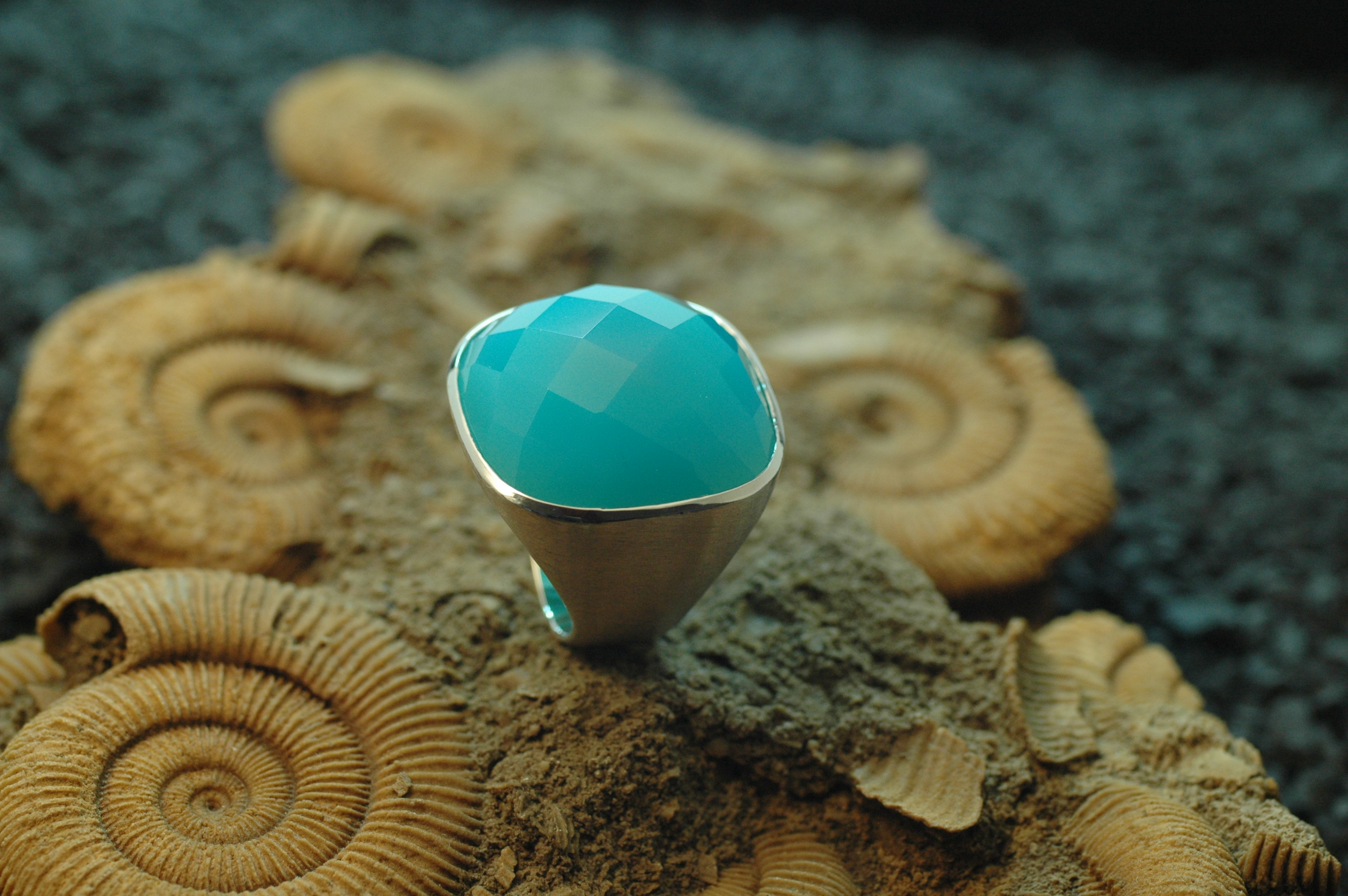 Ausdrucksstarker facettierter Türkis-Achat Silberring. Dieses außergewöhnlicher Schmuckstück wurde in Idar-Oberstein gearbeitet. Der leuchtende Stein wurde in Antikform geschliffen und hat eine Größe von 24x24mm.
