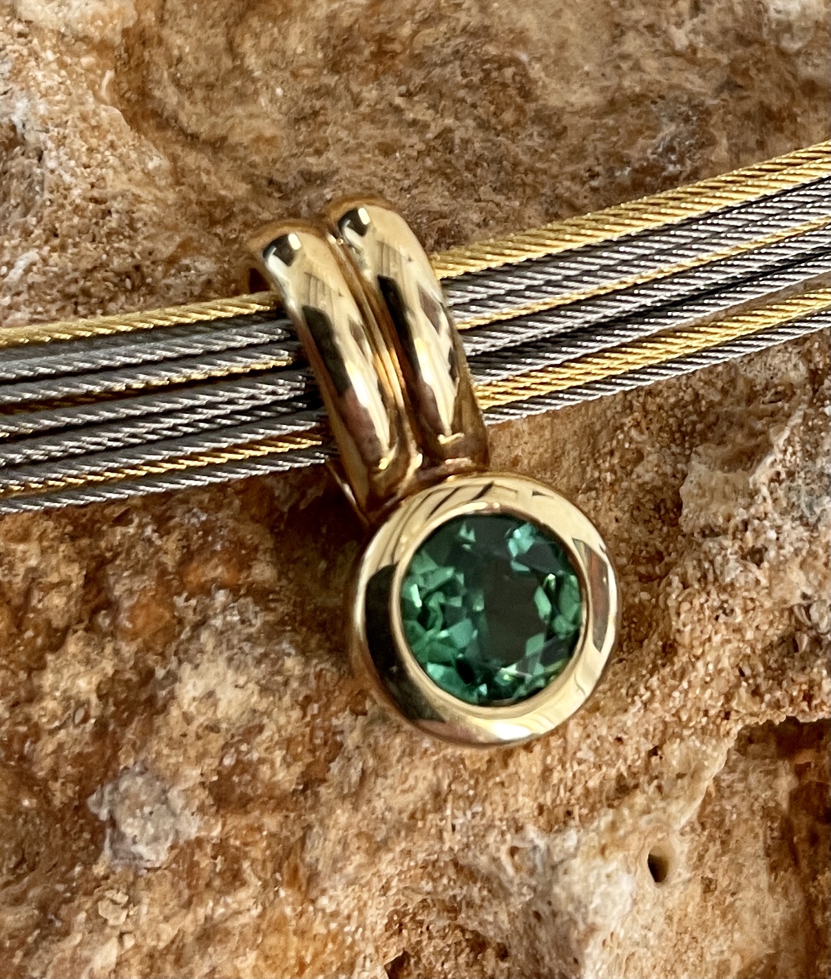 Elegant präsentiert sich dieser runde ca.6 mm große Afrikanische Turmalin Anhänger mit seinem prächtigen Glanz in grün und der formvollendeten