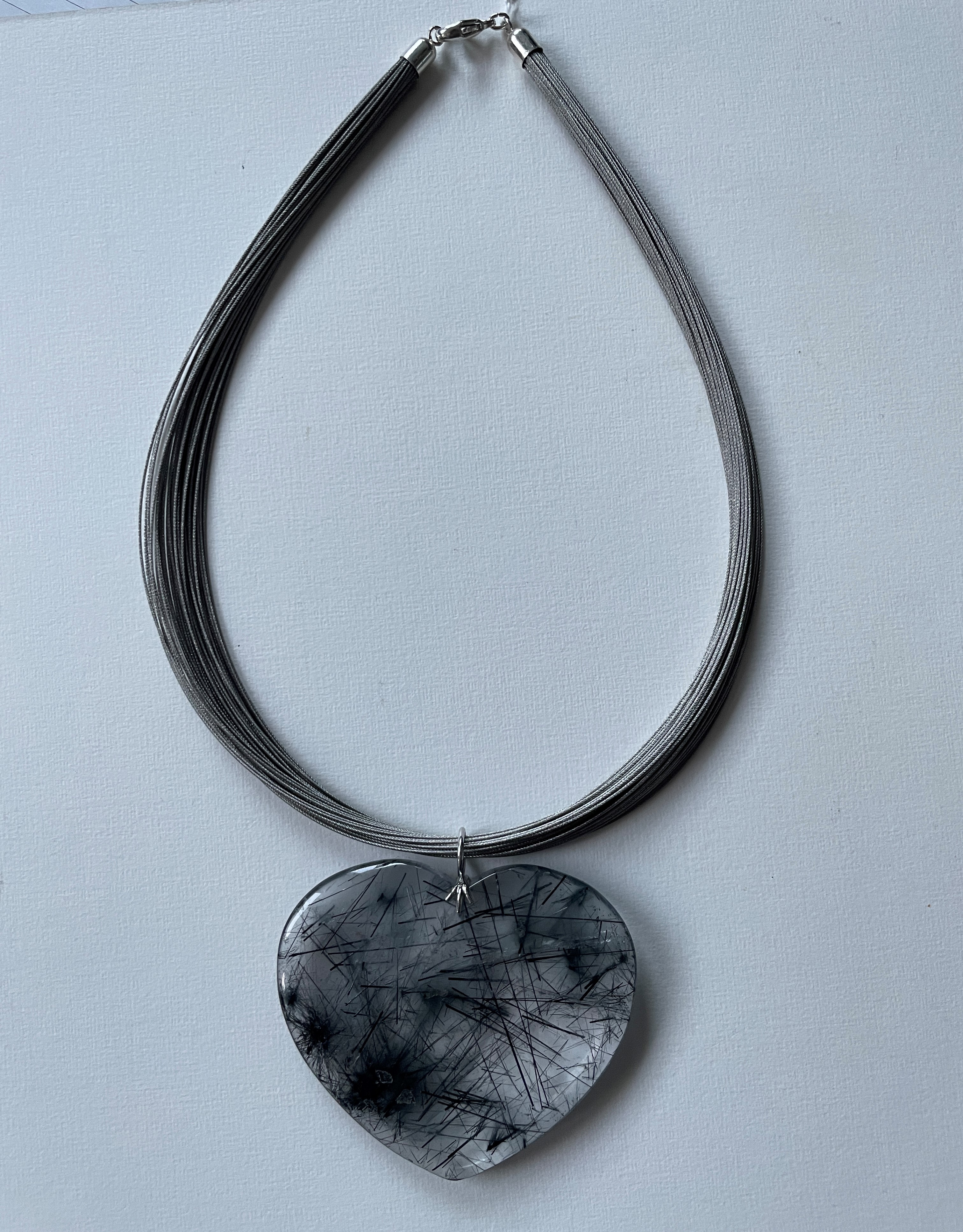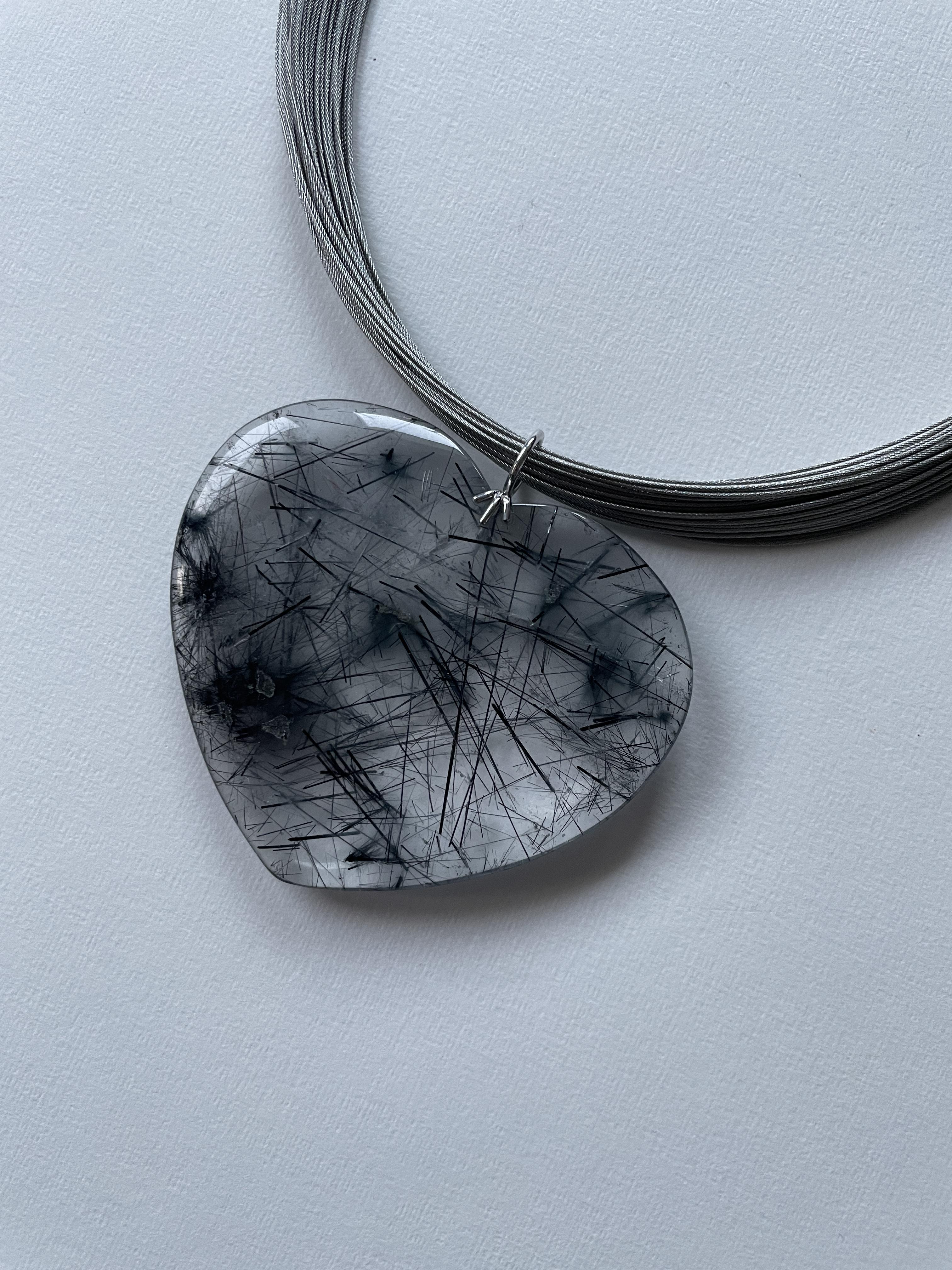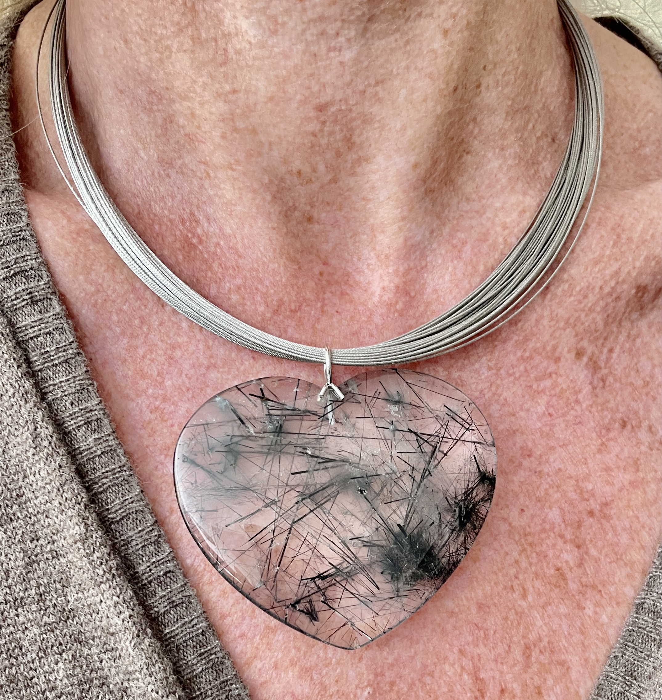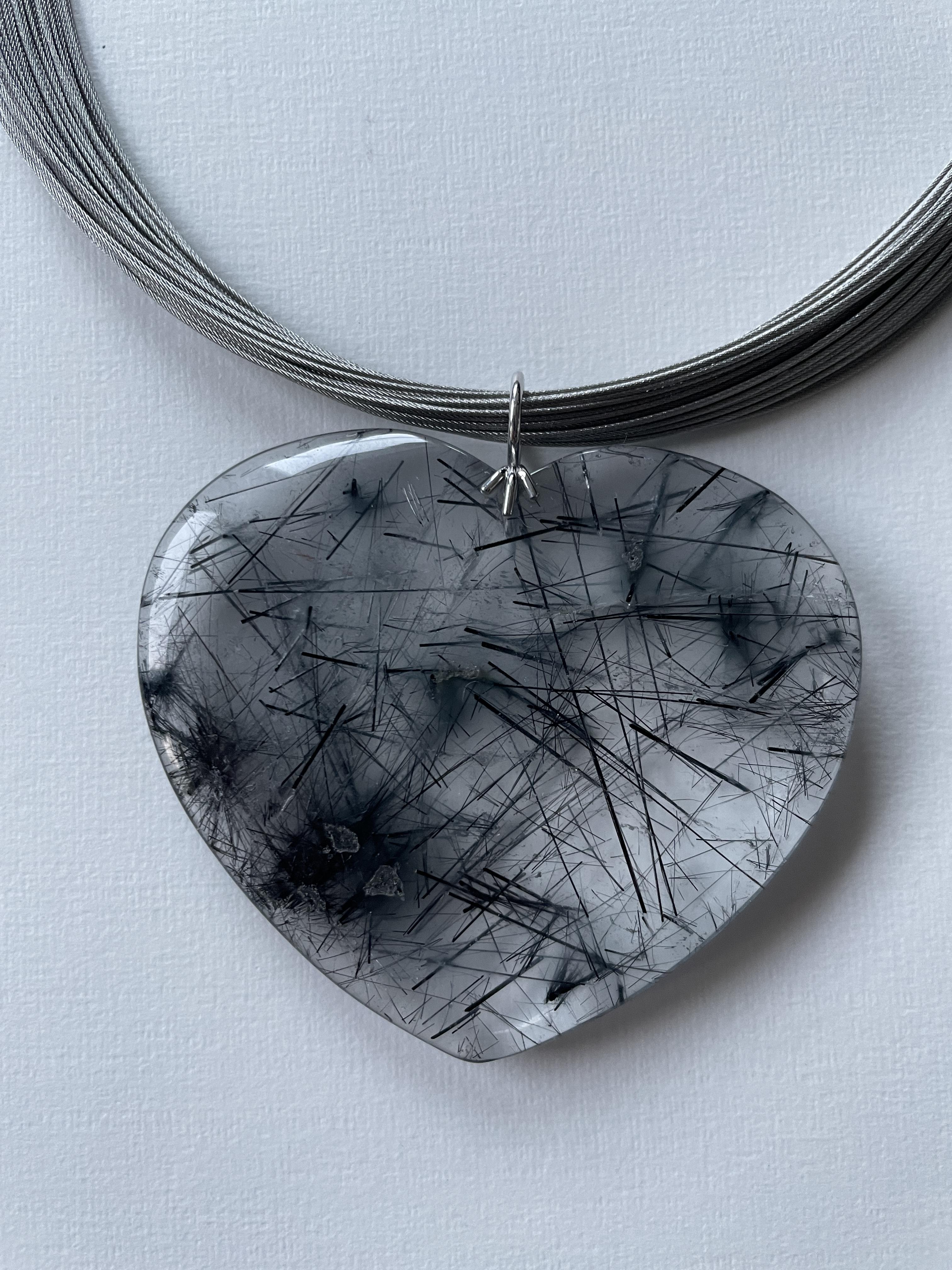 Dieses traumhafte Turmalinquarz Herz überzeugt Sie mit seinen schönen feinen Turmalinnadeln und dem eleganten Design. Das Herz hat eine Größe von. ca. 70 x 60 mm und ein Gewicht von ca.55 g. Geschmückt von einer hochwertigen 750 Weißgoldschlaufe, welche zeitlos und unkompliziert zu jedem Band passt. Das 50 reihige Edelstahlband in 42 - 45 cm mit praktischem Karabinerverschluss können Sie ebenfalls bei uns erwerben.