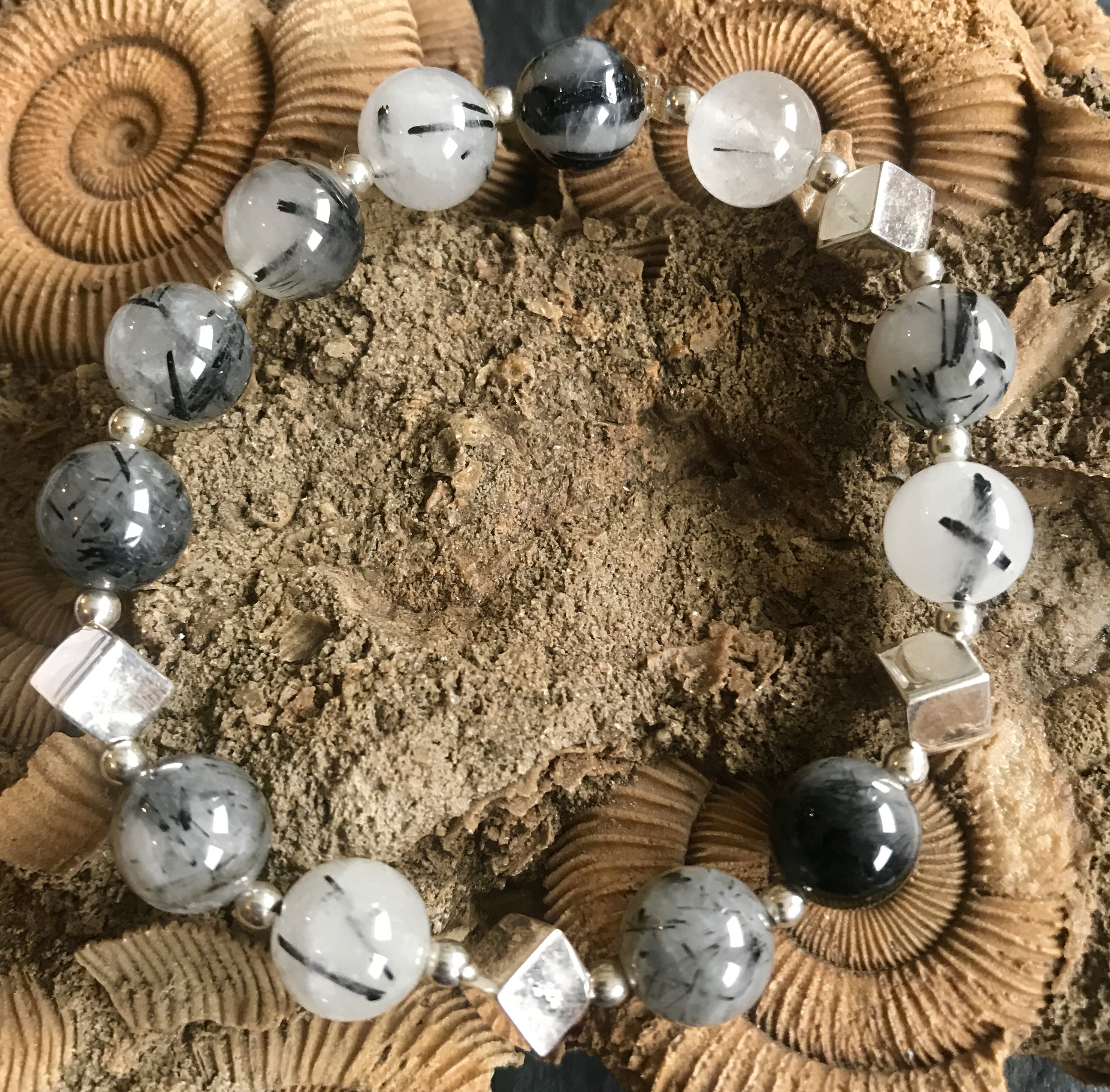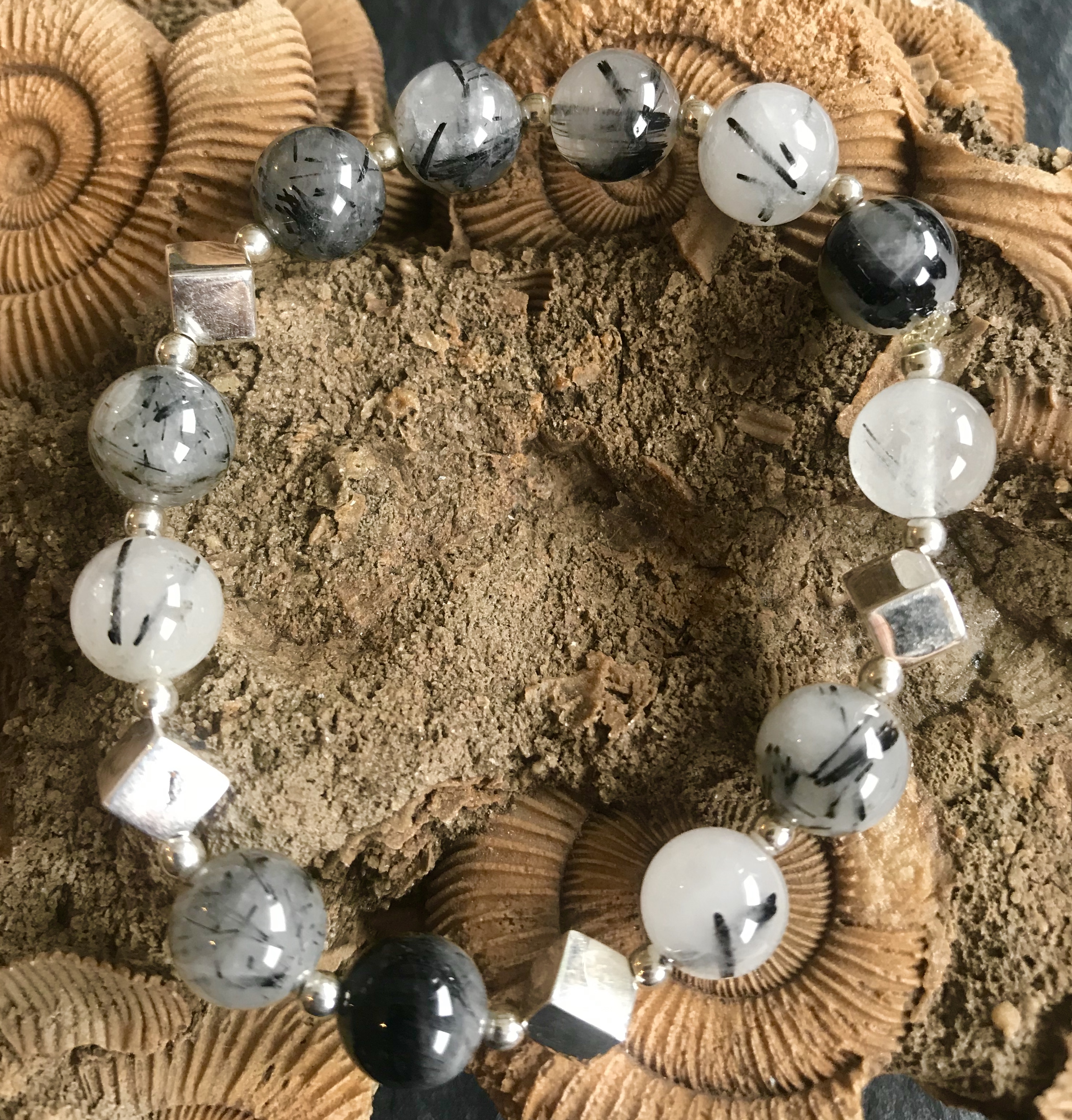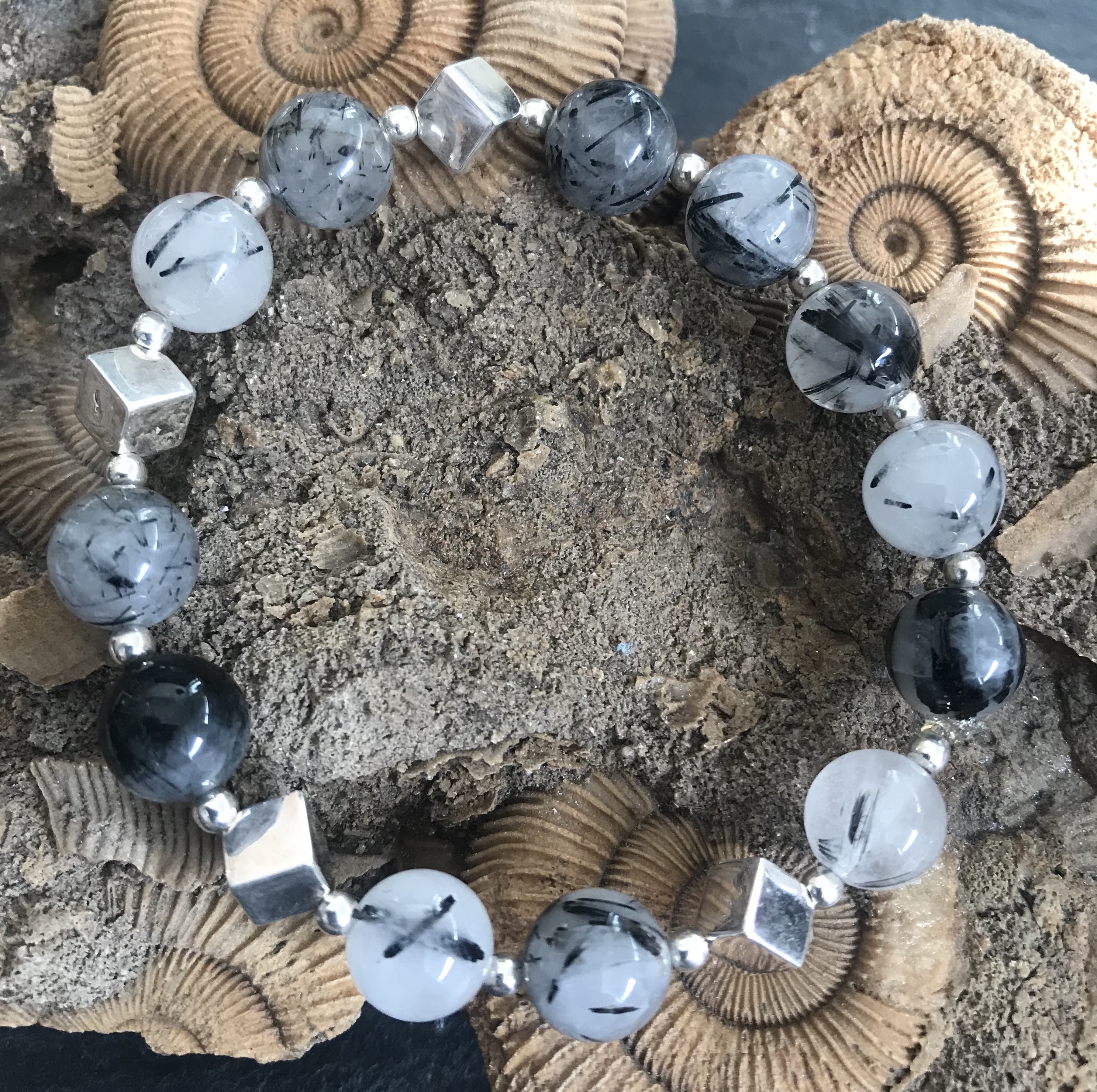 Dieses Elegante Kugelarmband aus Turmalinquarz wurde auf stabilem Gummiband aufgefädelt, zwischen den Kugeln befinden sich leuchtende Silberkügelchen und Würfel, die sich harmonisch einfügen.