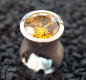 Besonders ausgefallener Silberring, den ein auffallend leuchtender, gelber Zirkonia von 18 mm Durchmesser krönt.